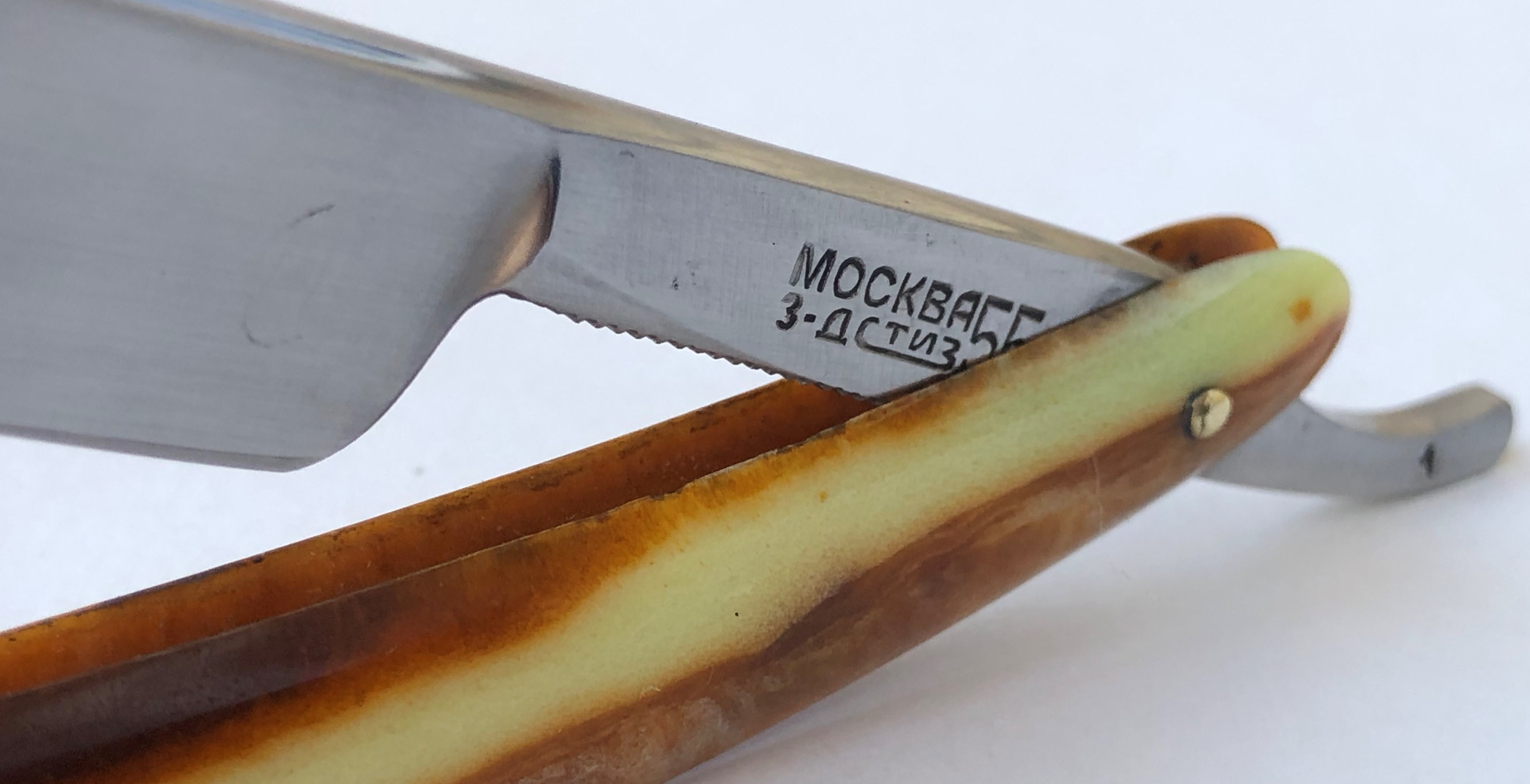 Бритва в пользовании не была, но требовала минимальных, косметических работ.Была разобрана-собрана,с освежением клинка до былого блеска и добавлением внутренних шайб.Попробовал повторить "заводской" гринд полотна.Кромочка равномерна по всей длине.