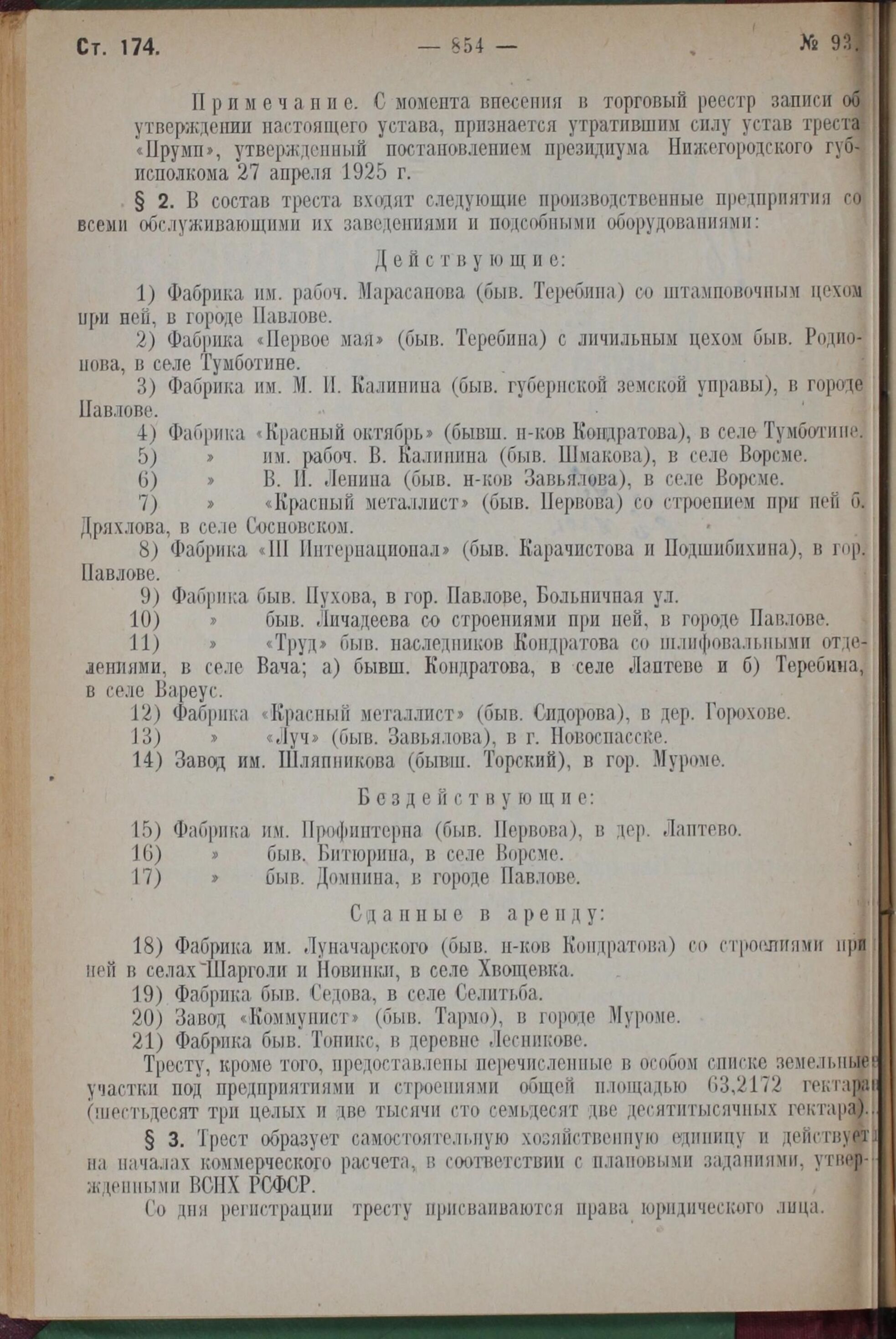 Постановление Всероссийского Центрального Исполнительного Комитета и Совета Народных Комиссаров. Об образовании государственного металлообрабатывающего Павлово-Муромского треста республиканского значения. 27 декабря 1927 года 1. Образовать государственный металлообрабатывающий Павлово-Муромский трест республиканского значения. 2. Из’ять из ведения Нижегородского и Владимирского губернских исполнительных комитетов и включить в состав треста, указанного в ст. 1 настоящего постановления, предприятия, входящие в настоящее время в состав Павловского районного управления металлической промышленности а также предприятия, входившие ранее в состав бывшего Муромского металлического треста, а в настоящее время вошедшие во Владимирский металлический трест. полностью постановление здесь: Spoiler Show УСТАВ государственного Павлово-муромского металлообрабатывающего треста «Павмурмет» § 1. Государственный промышленный трест республиканского значения под наименованием «Государственный Павлово-муромский металлообрабатывающий трест „Павмурмет”», состоящий в ведении Высшего совета народного хозяйства РСФСР, имеет своей целью производство и сбыт металлоизделий и действует на основании настоящего устава. Трест образуется на основании пост. ЭКОСО от 3 ноября 1927 г., (прот. №78, п.12) и приказа по ВСНХ РСФСР от 9 декабря 1927 г., № 174, путем слияния всех предприятий, входящих в Нижегородский государственный трест металлообрабатывающей промышленности Павловского района «Прумп» и предприятий быв. Муромского металлотреста, входящих ранее во Владимирский металлотрест. § 2. В состав треста входят следующие производственные предприятия со всеми обслуживающими их заведениями и подсобными оборудованиями: Действующие: 1) Фабрика им. рабоч. Марасанова (быв. Теребина) со штамповочным цехом при ней, в городе Павлове. 2) Фабрика «Первое мая» (быв. Теребина) с личильным цехом быв. Родионова, в селе Тумботине. • 3) Фабрика им. М. И. Калинина (быв. губернской земской управы), в городе Павлове. 4) Фабрика «Красный октябрь» (бывш. н-ков Кондратова), в селе Тумботине. 5) Фабрика им. рабоч. В. Калинина (быв. Шмакова), в селе Ворсме. 6) Фабрика В. И. Ленина (быв. н-ков Завьялова), в селе Ворсме. 7) Фабрика «Красный металлист» (быв. Первова) со строением при ней б. Дряхлова, в селе Сосновском. 8.) Фабрика «III Интернационал» (быв. Карачистова и Подшибихина), в гор.Павлове. 9) Фабрика быв. Пухова, в гор. Павлоре, Больничная ул. 10) Фабрика быв. Личадеева со строениями при ней, в городе Павлове. 11) Фабрика «Труд» быв. наследников Кондратова со шлифовальными отделениями, в селе Вача; а) бывш. Кондратова, в селе Лаптеве и б) Теребина,в селе Вареус. 12) Фабрика «Красный металлист» (быв. Сидорова), в дер. Горохове. 13) Фабрика «Луч» (быв. Завьялова), в г. Новоспасске. 14) Завод им.Шляпникова (бывш. Торский), в гор. Муроме. Бездействующие: 15) Фабрика им. Профинтерна (быв. Первова), в дер. Лаптево 16) Фабрика быв. Битюрина, в селе Ворсме. 17) Фабрика быв. Домнина, в городе Павлове. Сданные в аренду: 18) Фабрика им. Луначарского (быв. н-ков Кондратова) со строениями при ней в селах Шарголи и Новинки,в селе Хвощевка. 19) Фабрика быв. Седова, в селе Селитьба. 20) Завод «Коммунист» (быв. Тармо), в городе Муроме. 21) Фабрика быв. Тоникс, в деревне Лесникове. полностью устав можно скачать: Spoiler Show Кто сейчас на конференцииСейчас этот форум пр