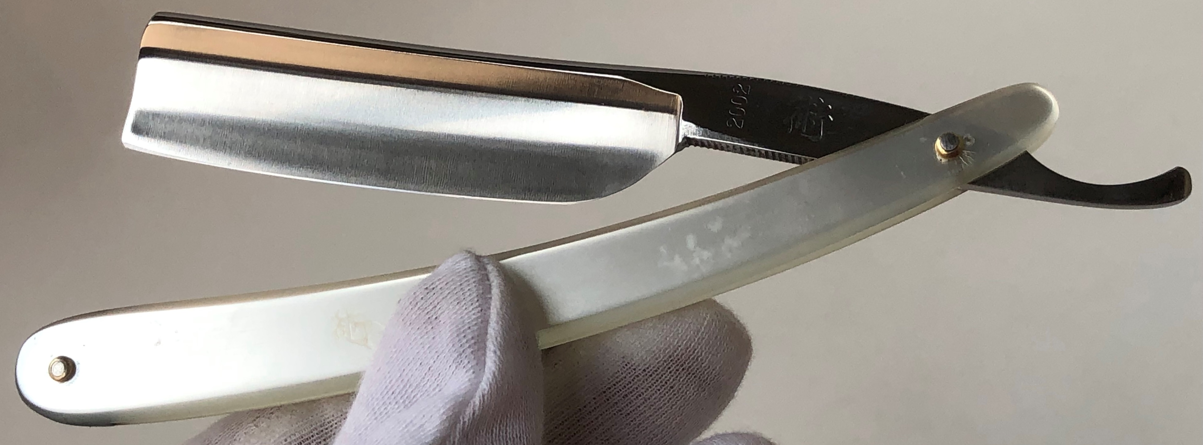 Бритва имеет 6,5 мм толстенный обушок.На таких японках обычно еще писали по западной традиции:-«for barbers use”. Либо разные вариации.Имеется ввиду,что за счет толстого обушка есть возможность бриться,не выставляя угол атаки ,а ставить ее плашмя,как по идее пользуются барберы. Также фирма Кикубоши ориентировалась на производстве именно профессионального парикмахерского инструмента. У меня имеются старинные японские каталоги для парикмахеров ,с рекламой Кикубоши .Поэтому и бритву подобную можно назвать профессиональной .