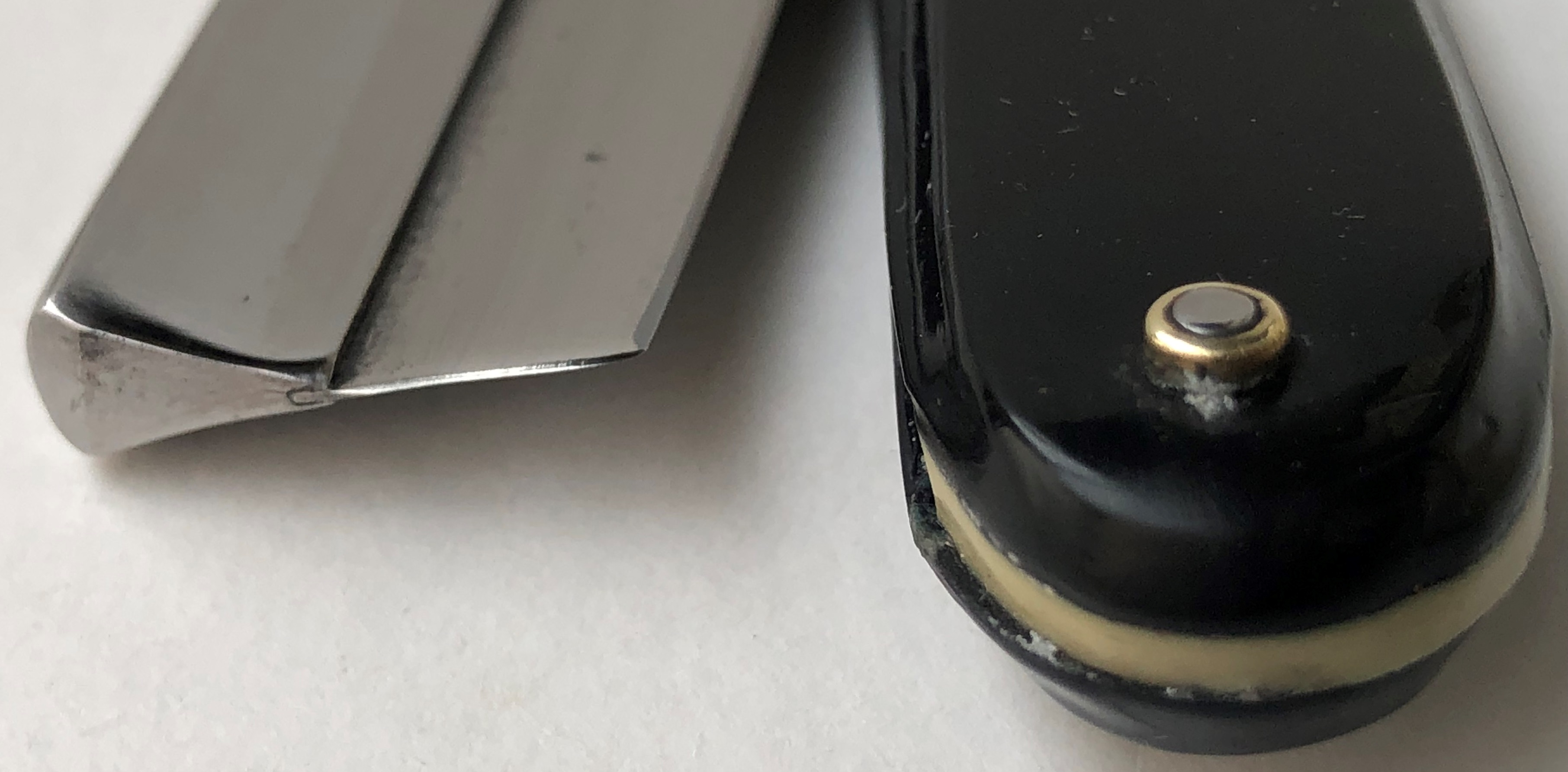 Бритва в очень хорошем состоянии для своих лет. Без активных следов пользования. УтОчки обушка не замечено. Бритва была разобрана, для проведения минимальных, косметических работ , без регринда и каких либо глубоких реставрационных действий.Замена пинов на более эффективные втулки.Кромочка равномерна по всей длине и еле заметна. Высококачественная "звонкая" углеродистая сталь,способная выдавать чистое и мягкое бритье. За счет мощного обушка бритва достаточно тяжёлая и удобная для бритья,в плане контроля во время процесса.