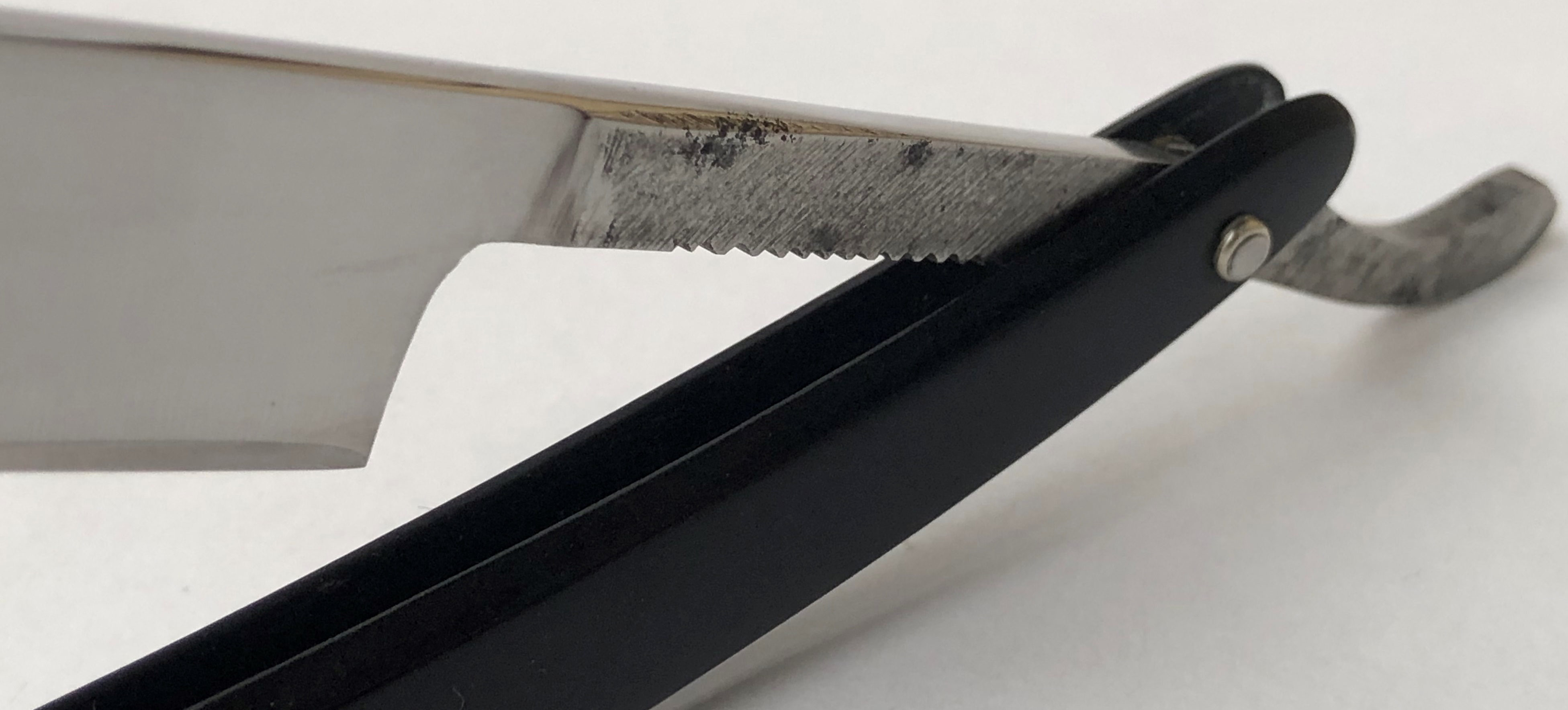 Бритву разобрал, привел в порядок и снова собрал,сохранив родные пины и добавив внутренние шайбы.Кромочка получилась несколько широкая, за счет более тонкого оригинального обушка.Умеренная шлифовка и полировка.Эффектные следы грубой шлифовка и патины на эрле.Как бреет , то сам пока не проверял, но с ходу сталь показалась годной.Думаю, что и с бритьем будет порядок.