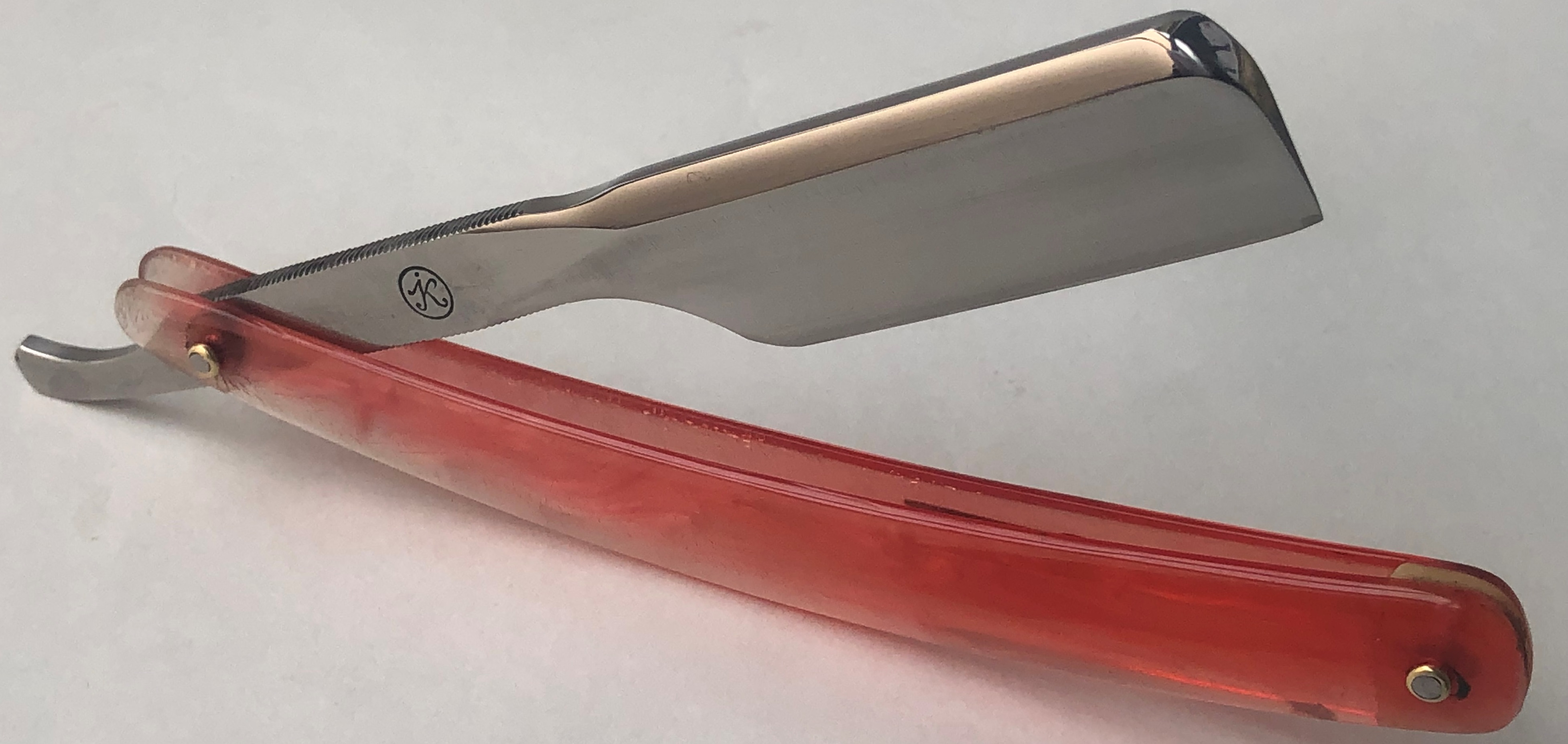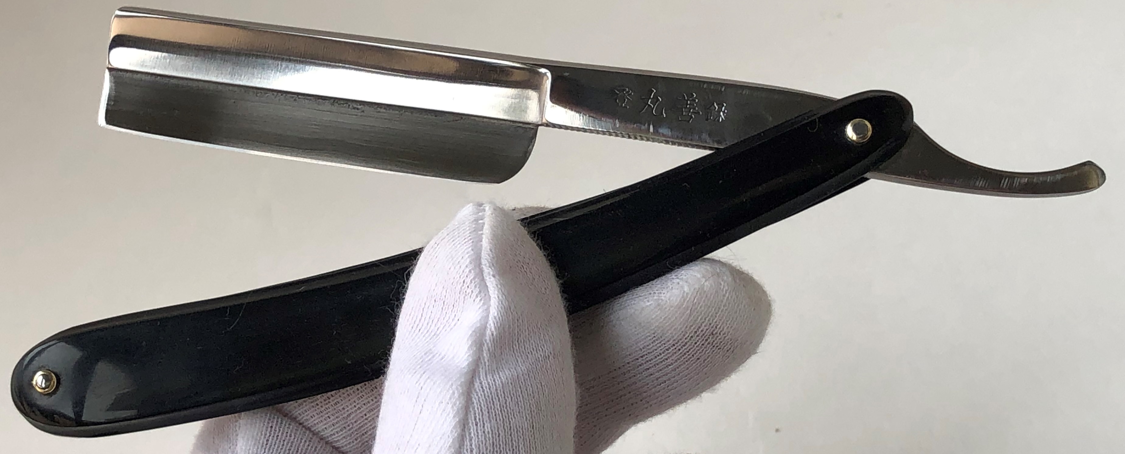 Бритва имеет 6,5 мм толстенный обушок.На таких японках обычно еще писали по западной традиции:-«for barbers use”. Либо разные вариации.Имеется ввиду,что за счет толстого обушка есть возможность бриться,не выставляя угол атаки ,а ставить ее плашмя,как по идее пользуются барберы. Также фирма Кикубоши ориентировалась на производстве именно профессионального парикмахерского инструмента. У меня имеются старинные японские каталоги для парикмахеров ,с рекламой Кикубоши .Поэтому и бритву подобную можно назвать профессиональной .