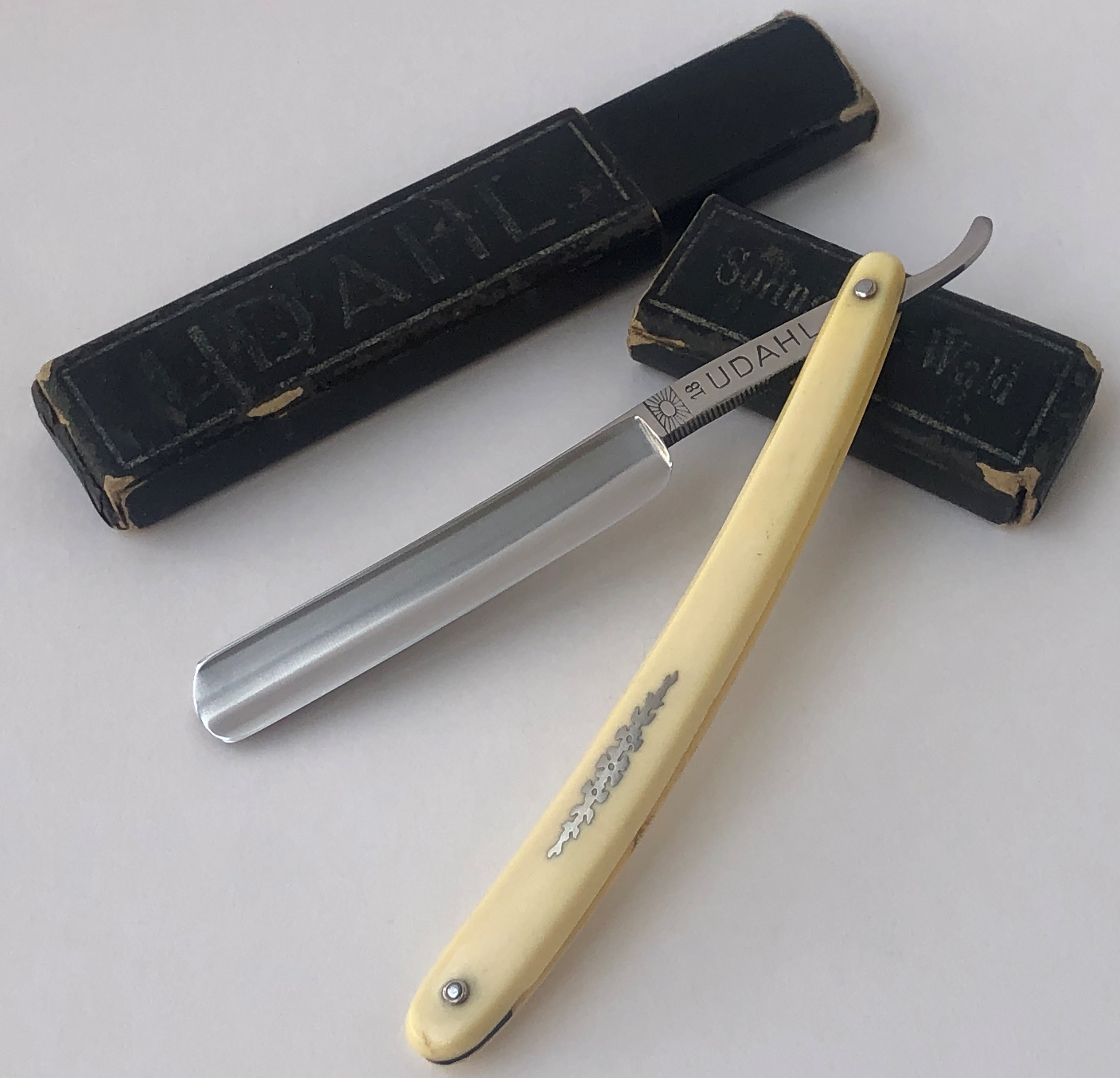 UDAHL 18-Solingen. Ширина полотна-15.2 мм. Толщина обушка-4.2 мм. Полная вогнутость. Углеродистая сталь. Первая половина прошлого века. Бритва в пользовании не была.Находится в прекрасном состоянии для своих преклонных лет. Минимально была освежена от старинной патины и царапин, с добавлением внутренних шайб и сохранением родных пинов.Отличная "звонкая" углеродка. Идеальная геометрия полотна:кромочка равномерна по всей длине и еле заметна. Оригинальная коробочка! Бритва подойдёт как для новичка, так будет удобна для опытного пользователя, а также для коррекции усов и бороды. Очень хороший и удобный старинный экземпляр, так что не пропустите. Цена-12500 р с доставкой.ПРОДАН Внимание! Важная информация! Spoiler Show