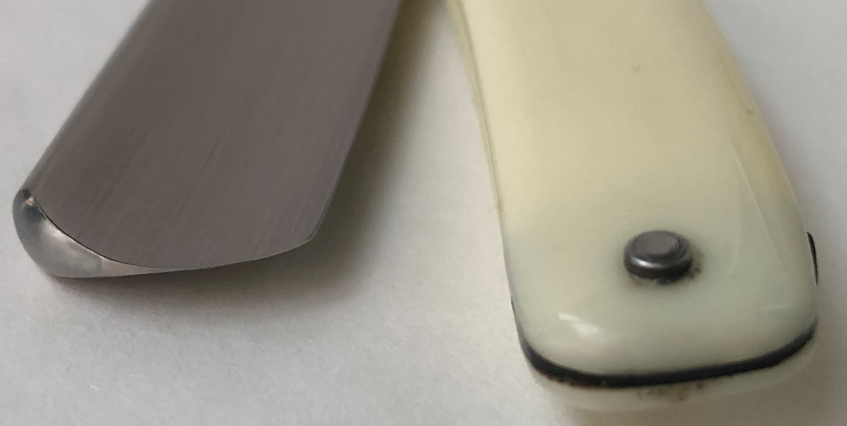 SCISSOR&RAZOR.CO-SHEFFIELD Ширина полотна-18.5 мм. Толщина обушка-6.4 мм. Форма лезвия-клин. Углеродистая сталь. Бритва с минимальными следами пользования,судя по отсутствию сточенности обушка. Никакого глубокого регринда не производилось. Только умеренная шлифовка и полировка.Кромочка с одной стороны ровная, а с другой имеет небольшую ,слегка заметную "волну".Но тут нужно сделать скидку на приличный возраст инструмента. Также,на сколько известно,на старинных клинах в то время не сверлили отверстие под осевой пин, а пробивали.Поэтому само отверстие было не всегда правильной формы, достаточно широким и неровным. В данном экземпляре отверстие пробито не только не перпендикулярно эрлю, но и немного в сторону, поэтому сам клинок относительно оправы лежит как бы на боку, но в тоже время сами плашки не цепляет.Поэтому данный нюанс никак не влияет на дальнейшую эксплуатацию бритвы,поэтому что то тут исправлять не стал и оставил как есть. Особо хочется отметить старинный "медовый" ,натуральный и родной рог оправы. Сама по себе среднего размера. Смею предположить, что ширина +- родная, так как следов от камней на обушке не было, т.е. бритва если и использовалась, то крайне мало. Само название бритвы "ножницы и бритва" как бы намекает, что фирма занималась изготовлением профессионального инструмента. Бритва тяжёлая и хорошо чувствуется в руке. Со всеми нюансами бритва для меня недорогая, поэтому 14500 р с доставкой будет самое то.. Заточена и готова к бритью. Внимание! Важная информация! Spoiler Show