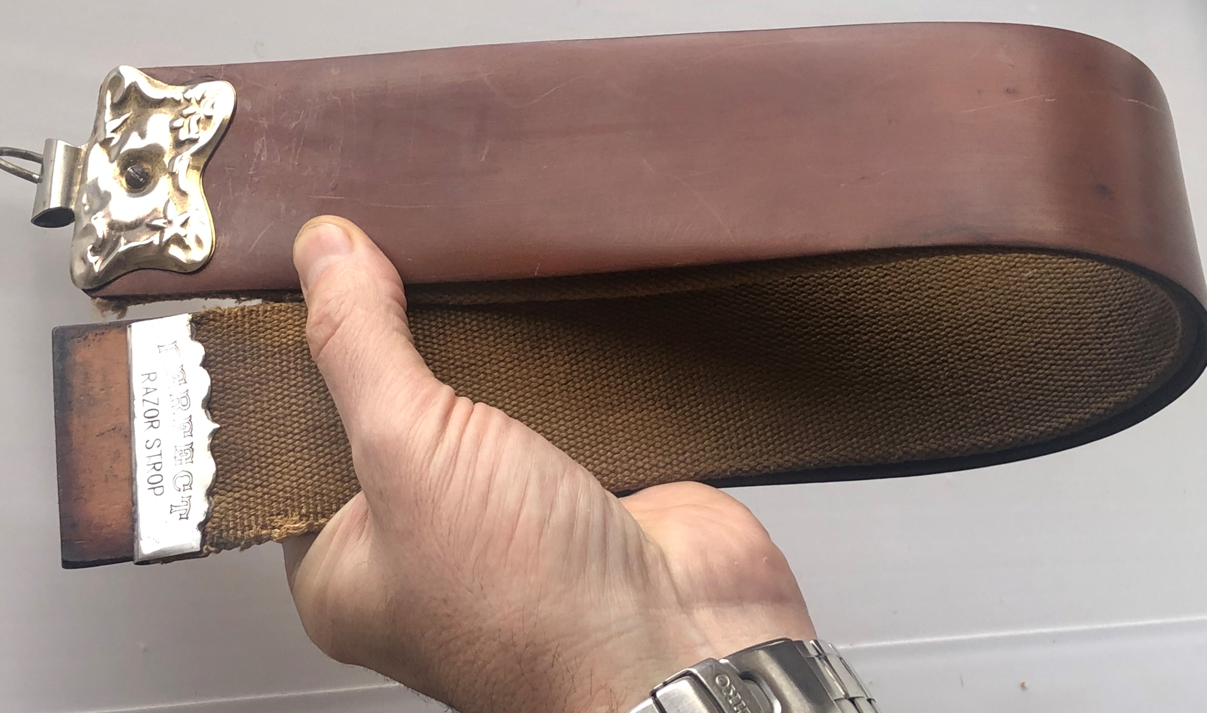 Кожа умеренно эластичная, что очень хорошо,так как в процессе правки станет более мягкой, зеркальной и еще более эластичной, но в тоже время не такой "жидкой", как можно было наблюдать на многих современных ремнях Канаяма.Снизу и с обратной стороны кордована можно увидеть потемнения и какие то пятна,возможно от попадания воды, возможно еще что то,что на качестве и состоянии кожи никак не сказалась, так что тут можно особо не обращать внимание.Вторая льняная стропа в относительно хорошем состоянии.Была простирана. Имеет снизу потертости,но не критично.В общем и целом очень неплохой экземпляр, примерно равных канаямовским ремням 60000-80000 моделям.