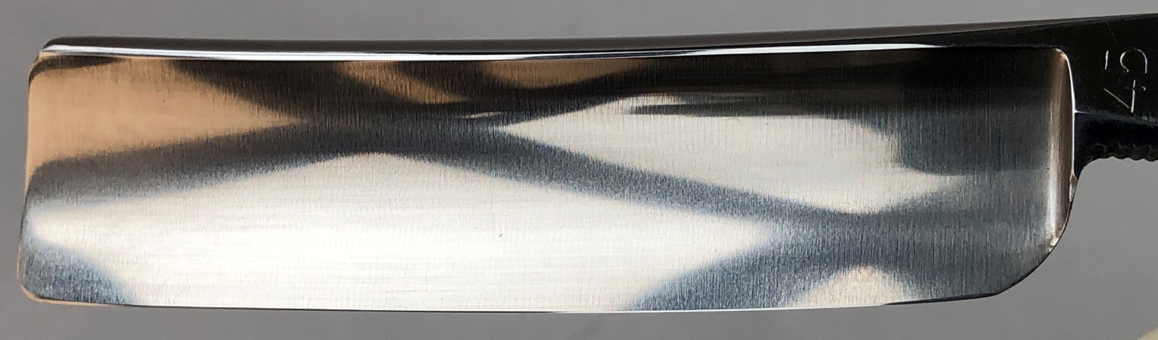 Бритва исключительного коллекционного состояния. Совершенно нетронутая заточными камнями и временем. Как только вчера с завода. Клинок покрыт заводской защитной, масляной плёнкой.(этот защитный слой стирать не стал, а оставил как есть). Электро-химический след от заводской заточки. Равномерна кромочка по всей длине. Заточка оригинальная. По желанию бритва будет переточена и доведена до состояния брития.