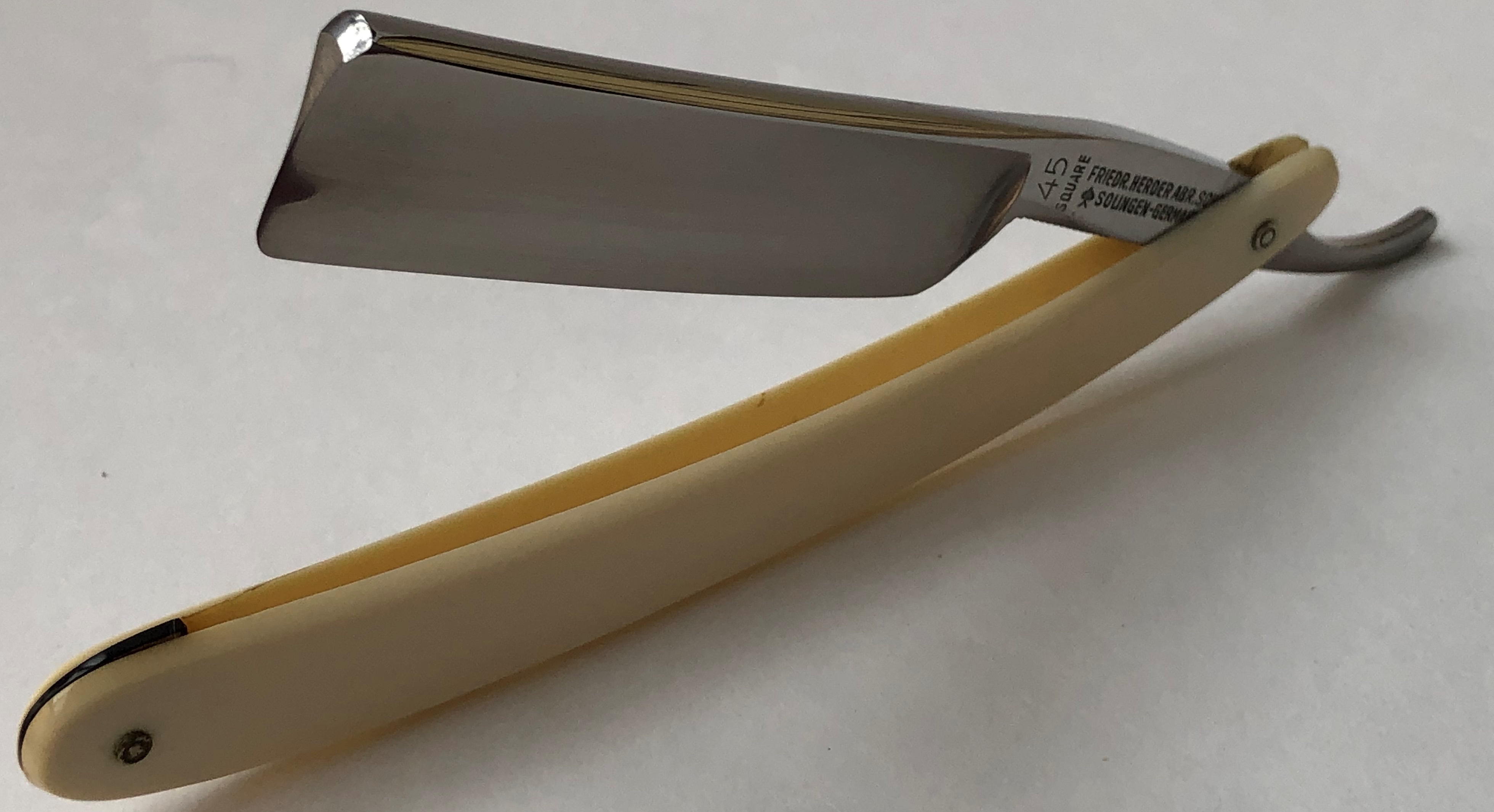 За 100+ лет бритва прекрасно сохранилась и без видимых следов пользования.Никакого регринда, а только умеренная и минимальная шлифовка и полировка.Идеальная геометрия полотна:кромочка равномерна по всей длине.Добавил внутренние шайбы, а также поставил более эффективные двух-цветные втулки. Красивая пластиковая оправа. Бритва среднего размера и опытный пользователь в состоянии оценить ее в полной мере.Ну и для новичка будет тоже неплоха,как качественная,удобная и относительно недорогая вещь.Не пропустите реально красивую,высококачественную,старинную бритву от одного из самых лучших немецких производителей прошлого.