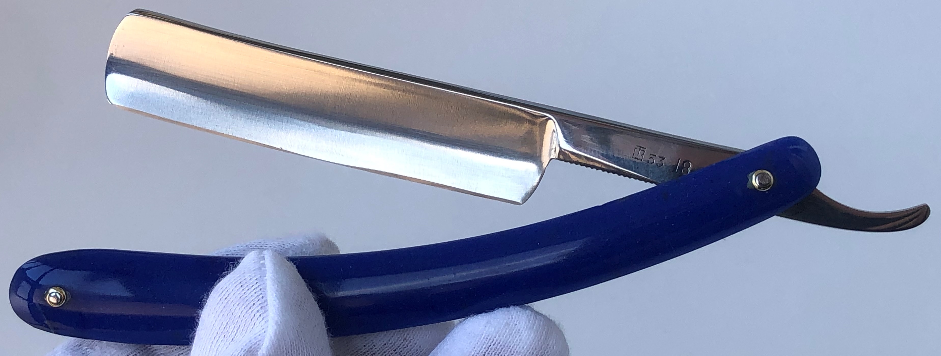 Бритва в очень хорошем состоянии и в пользовании не была. Требовала разборки, для минимальных,косметических работ.Поменял родные заклёпки на двух-цветные втулки, с добавлением внутренних шайб.Геометрия клинка на уровне:кромочка равномерна по всей длине, за исключением небольшой "волны" по центру полотна.Не критично, так как на процесс заточки и бритья никак не влияет.Ярко-синяя оправа.Родная коробочка. Бритва заточена и готова к бритью.
