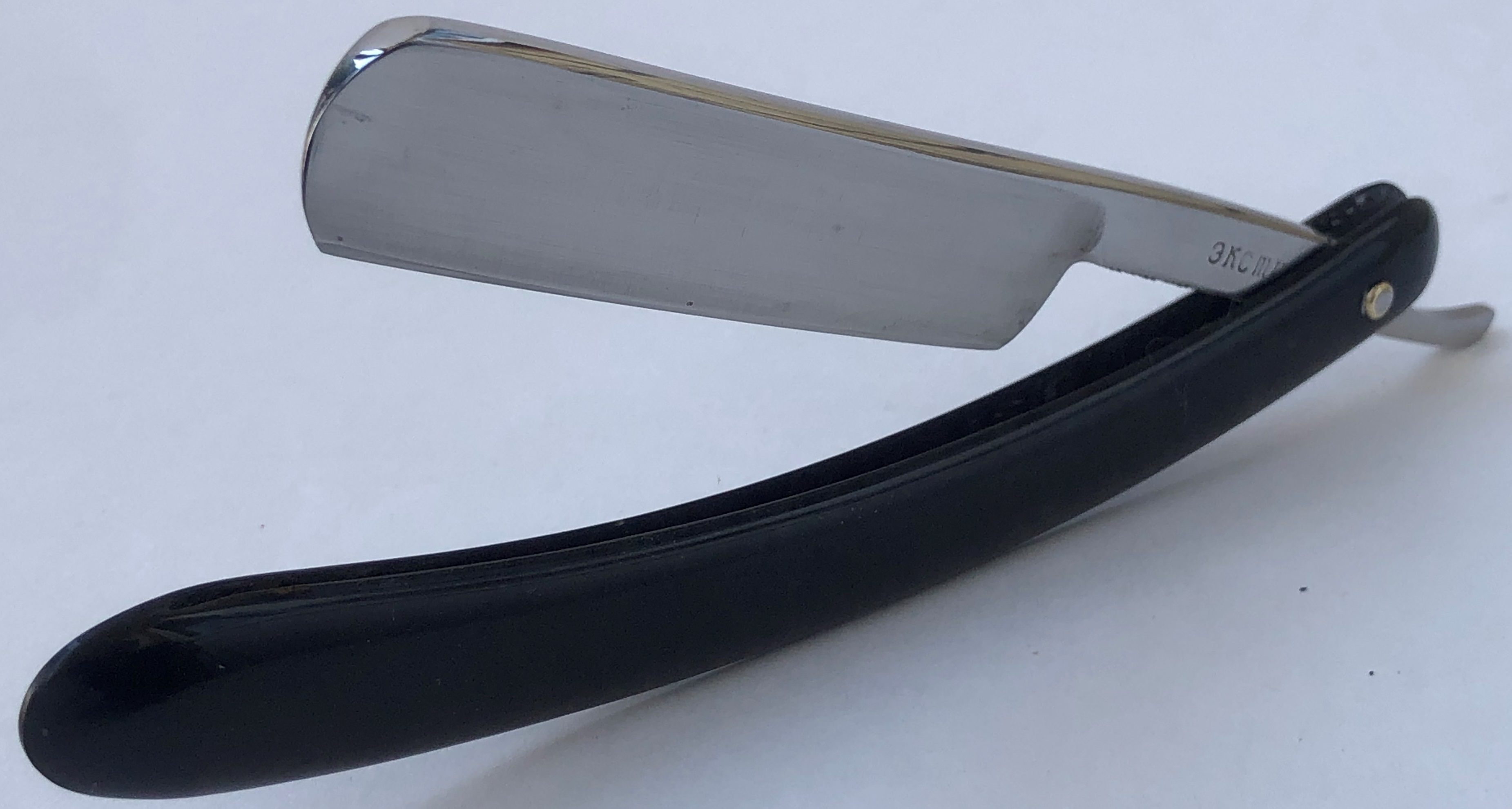 Бритва в идеальном состоянии и заточена была впервые,без изоленты.Идеальная геометрия полотна:кромочка равномерна по всей длине.Бритва создана из цельного куска металла, а не более классическим способом,из двух сваренных частей.Родная резиновая ручка также в отличном состоянии.Очень неплохой и достаточно недорогой экземпляр в коллекцию.