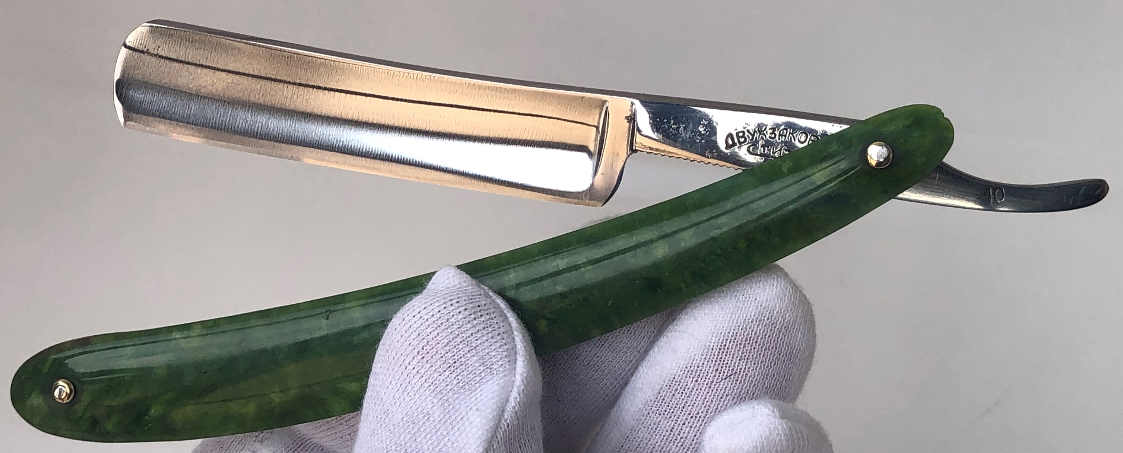 Бритва в хорошем, рабочем состоянии. Был восстановлен клинок,от утОчки обушка и удаления патины. Кромочка почти ровная по всей длине.Ручка, хоть и имеет незначительный скол(фото), но имеет красивый и редкий "малахитовый" оттенок. Не стал заморачиваться с заменой оправы, а оставил как есть, тем более,что это ни на что не влияет.Новый двух-цветные втулки и внутренние шайбы.Родная коробочка того же 1956 года! Совсем недорогая бритва для новичка! Не пропустите.