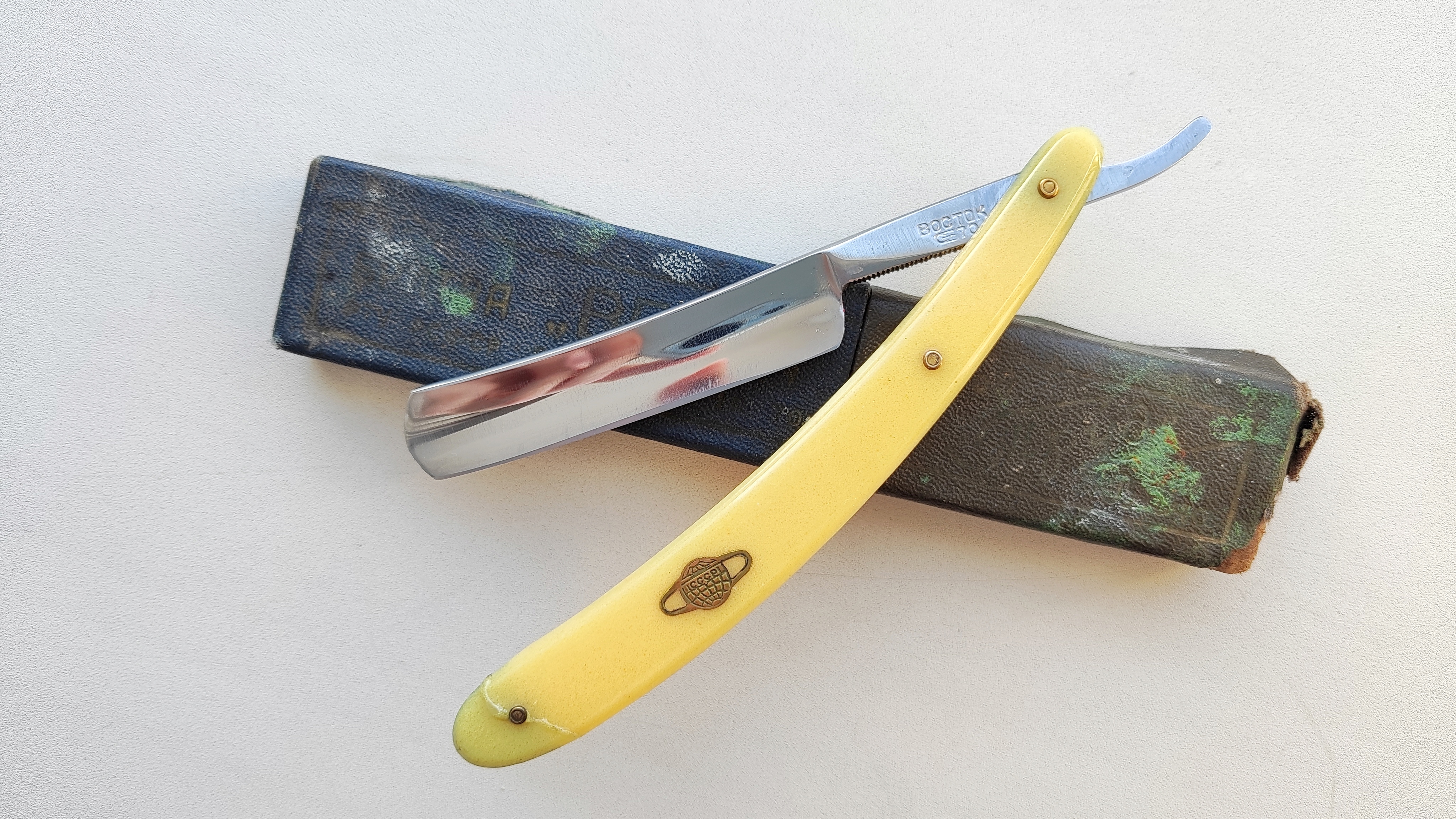 Опасная бритва Москва, завод СТИЗ, 1954 год. Когда то была гравюра на полотне (не знаю какая). Ширина полотна 14 мм у носа с расширением до 15.5 мм к пятке, все родное, без футляра. Ко мне попала со следами старого регринда, прошелся вручную наждачками, полиролью и подготовил к бритью. Остались некоторые остаточные следы от регринда, кромка чистая. Геометрия в порядке, сталь не перегрета, в рабочем плане вполне хороший был регринд. Маленькую трещинку у пина подклеил. Почётный 1954 год, качественная углеродистая сталь, красивая оправа под янтарь/древесину. Отличный вариант попробовать опасное бритье за недорого, когда нужны не шашечки, а просто ехать.
