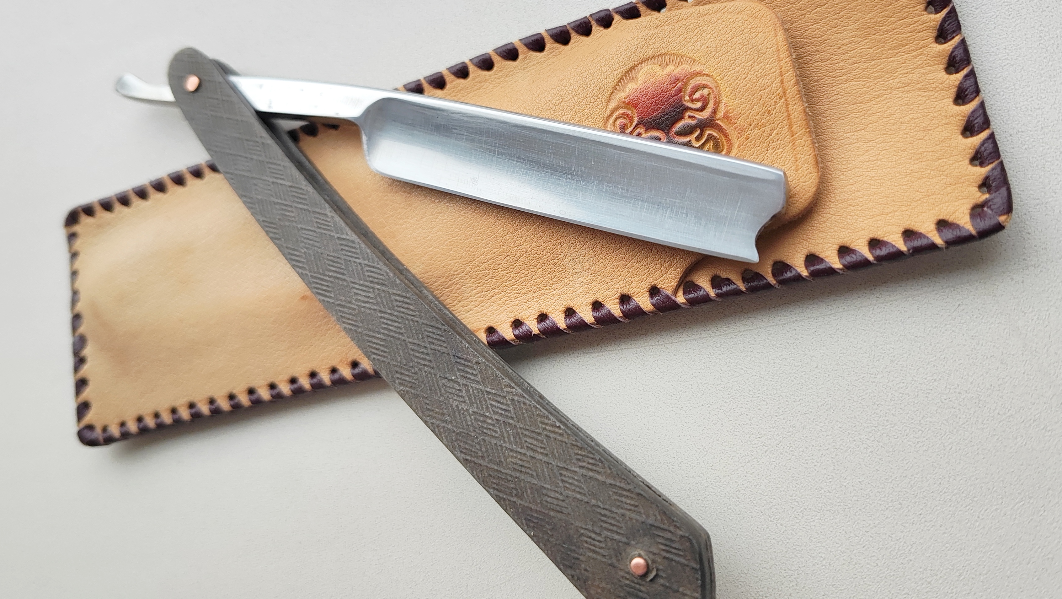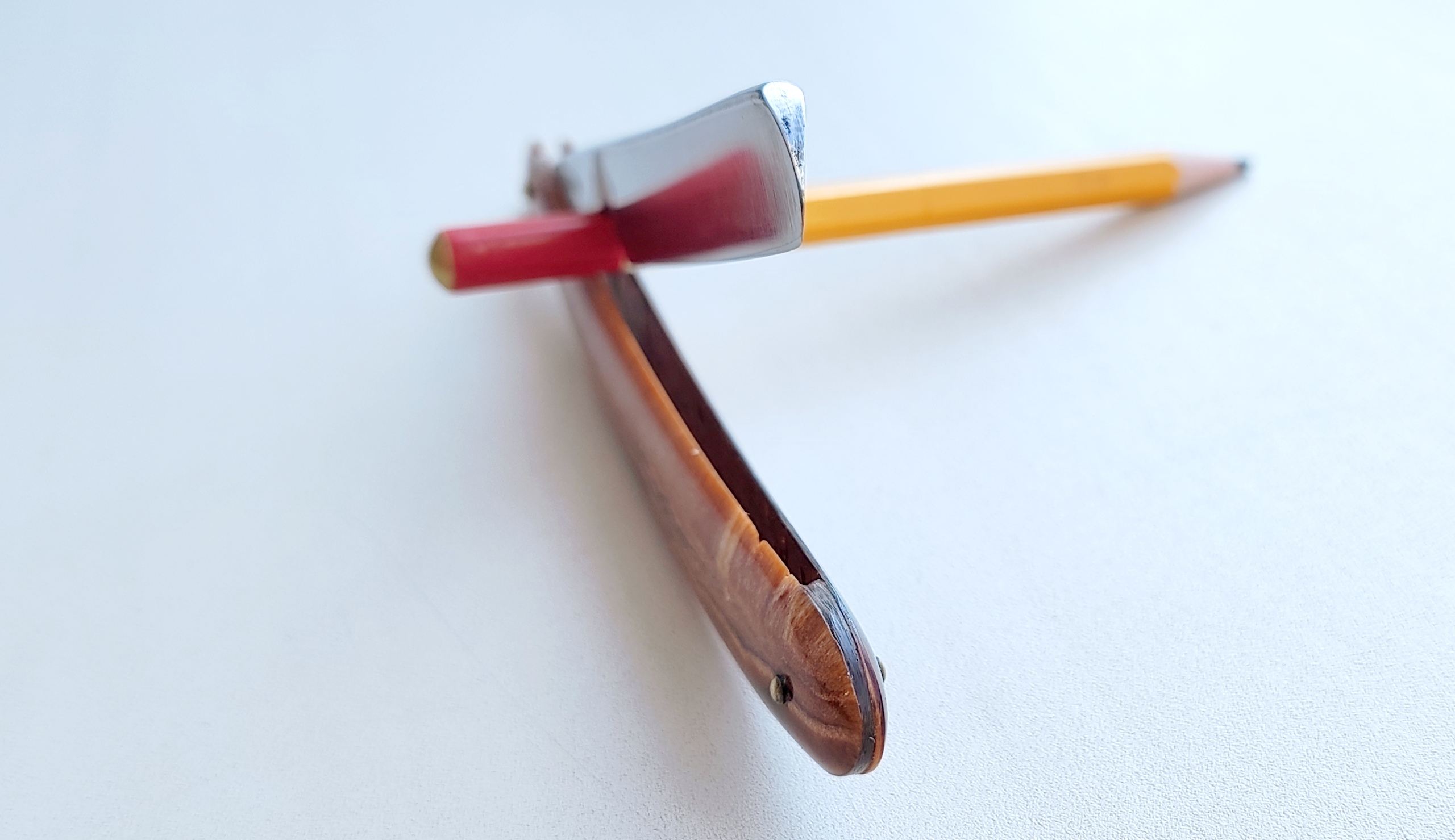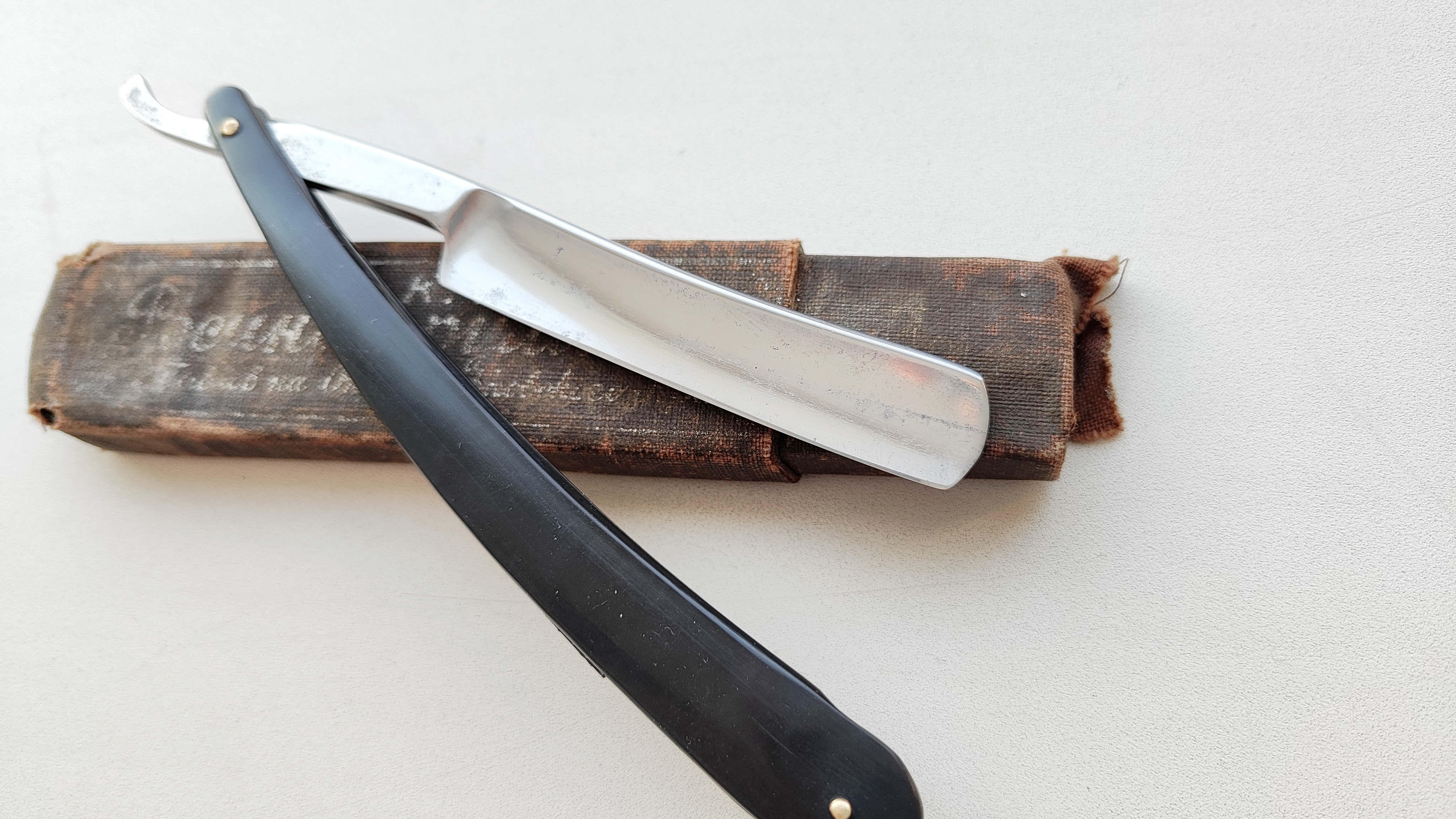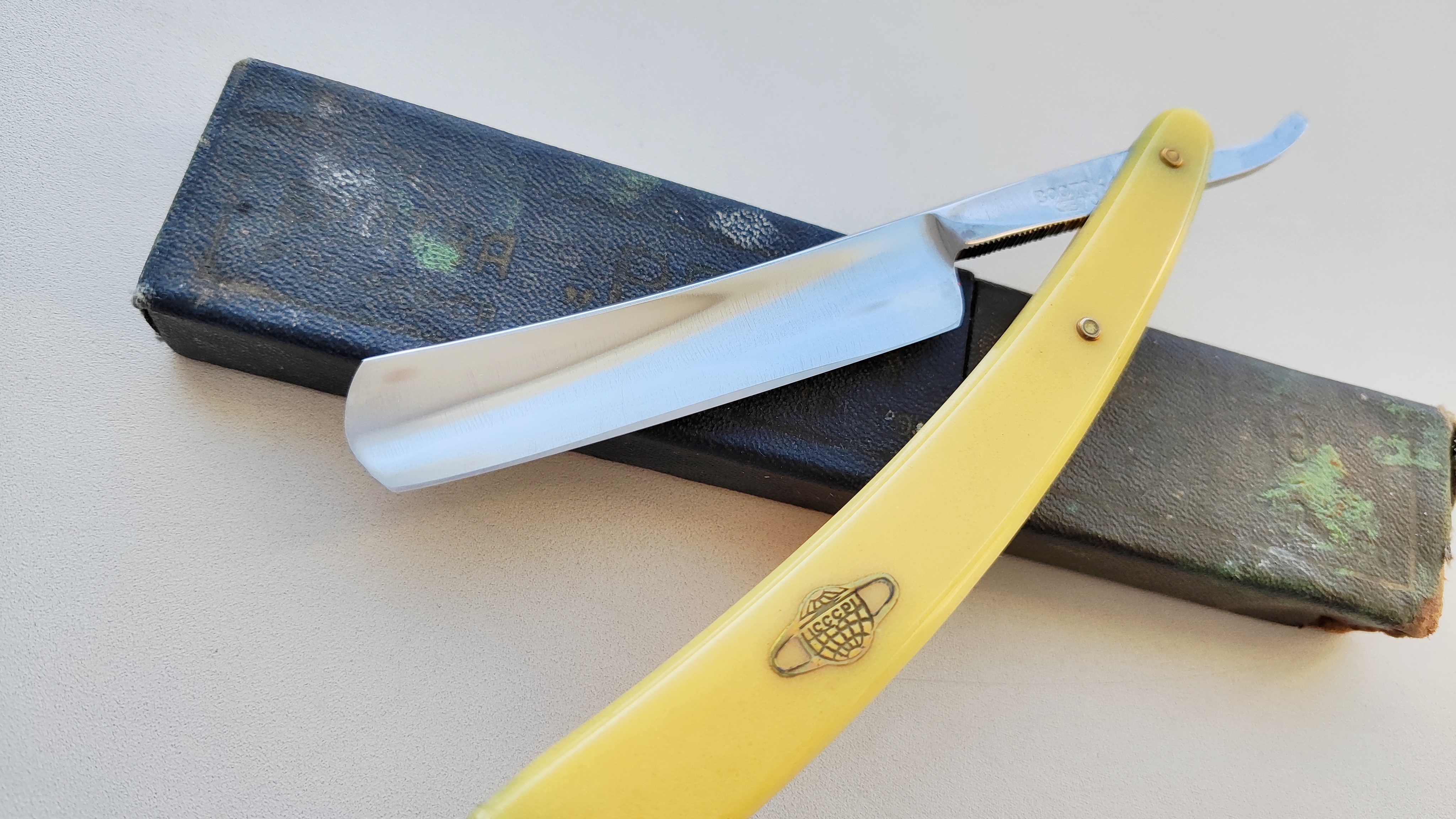 Опасная бритва Москва, завод СТИЗ, 1954 год. Когда то была гравюра на полотне (не знаю какая). Ширина полотна 14 мм у носа с расширением до 15.5 мм к пятке, все родное, без футляра. Ко мне попала со следами старого регринда, прошелся вручную наждачками, полиролью и подготовил к бритью. Остались некоторые остаточные следы от регринда, кромка чистая. Геометрия в порядке, сталь не перегрета, в рабочем плане вполне хороший был регринд. Маленькую трещинку у пина подклеил. Почётный 1954 год, качественная углеродистая сталь, красивая оправа под янтарь/древесину. Отличный вариант попробовать опасное бритье за недорого, когда нужны не шашечки, а просто ехать.