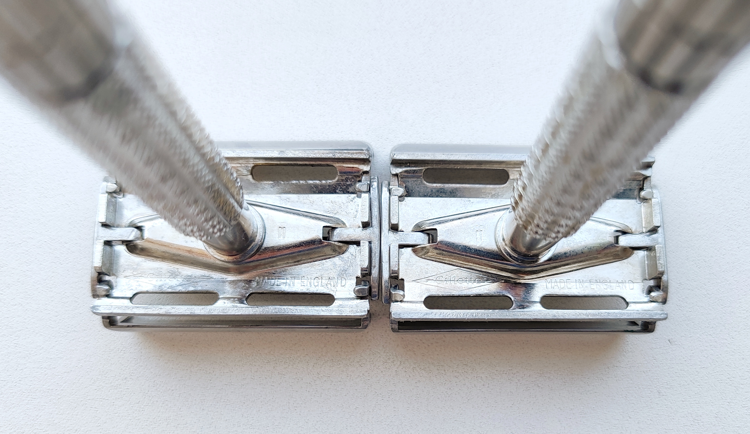Т-образная безопасная бритва Gillette Rocket Flare Tip, Brit Pat. 694093 / Made in England, конец 50х, начало 60х, Великобритания, конструкция "бабочка", TTO (twist to open - поверните чтобы открыть). В наличии две штуки, станки почистил, внутри и снаружи. Механизмы смазал специальной смазкой, чтобы все крутилось веселее. Механика в отличном виде, открывается/закрывается штатно. Классические бабочки, комфортные и эффективные с острым лезвием. Производились после Gillette Fatboy и в период производства Gillette Slim, но не в США, а в Англии, на их заводе.