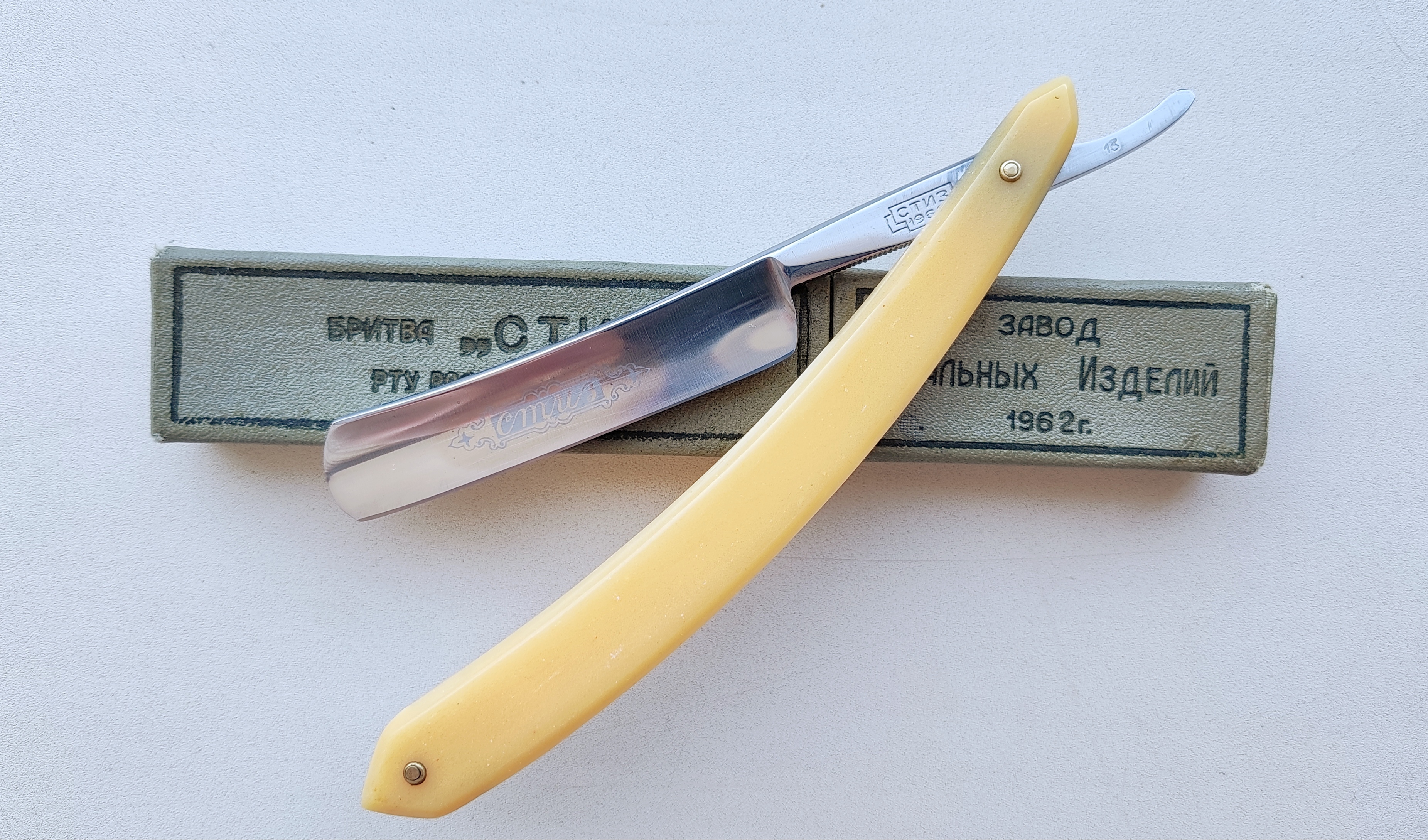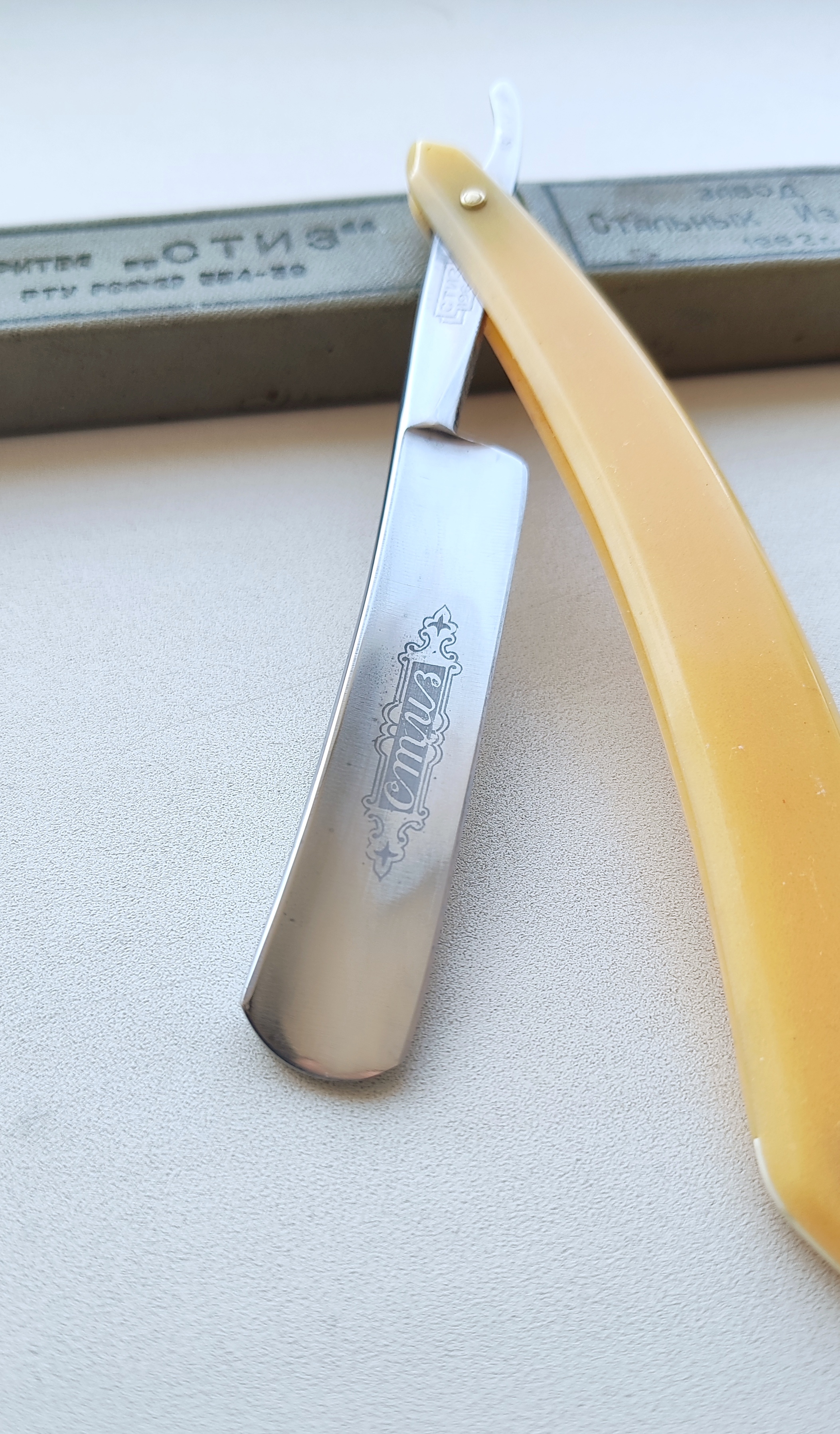 Фирменная бритва с завода СТИЗ с одноимённым названием и красивой гравюрой. Сталь весьма приятная и качественная.