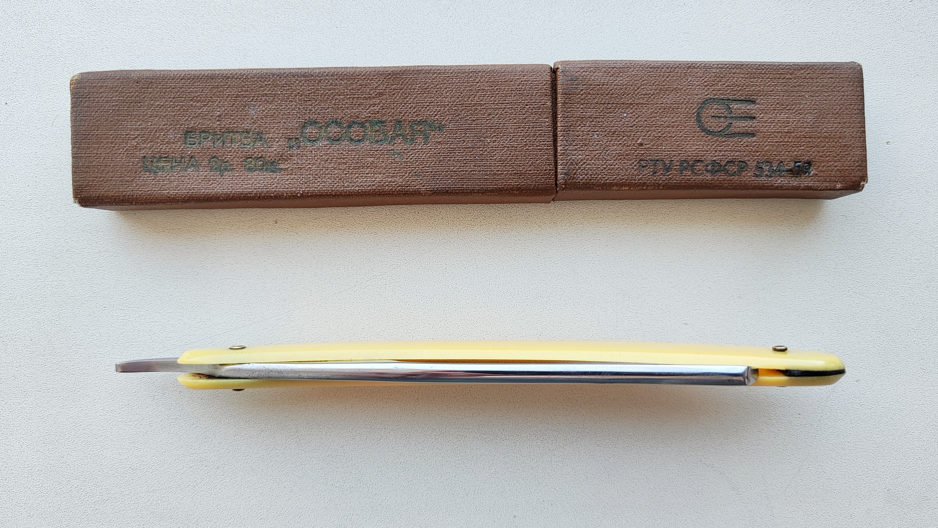 Опасная бритва Особая, завод СТИЗ, 1970 год. Ширина полотна 17.5 мм, все родное, футляр тоже. Ко мне попала с заводской заточкой, но в патине. Почистил вручную (какие то мелкие матовости немного остались, кромка чистая) и подготовил к бритью. Геометрия хорошая, ширина для этой модели - отличная. Особая очень ценилась среди советских парикмахеров за выдающиеся рабочие качества и удобство пользования.