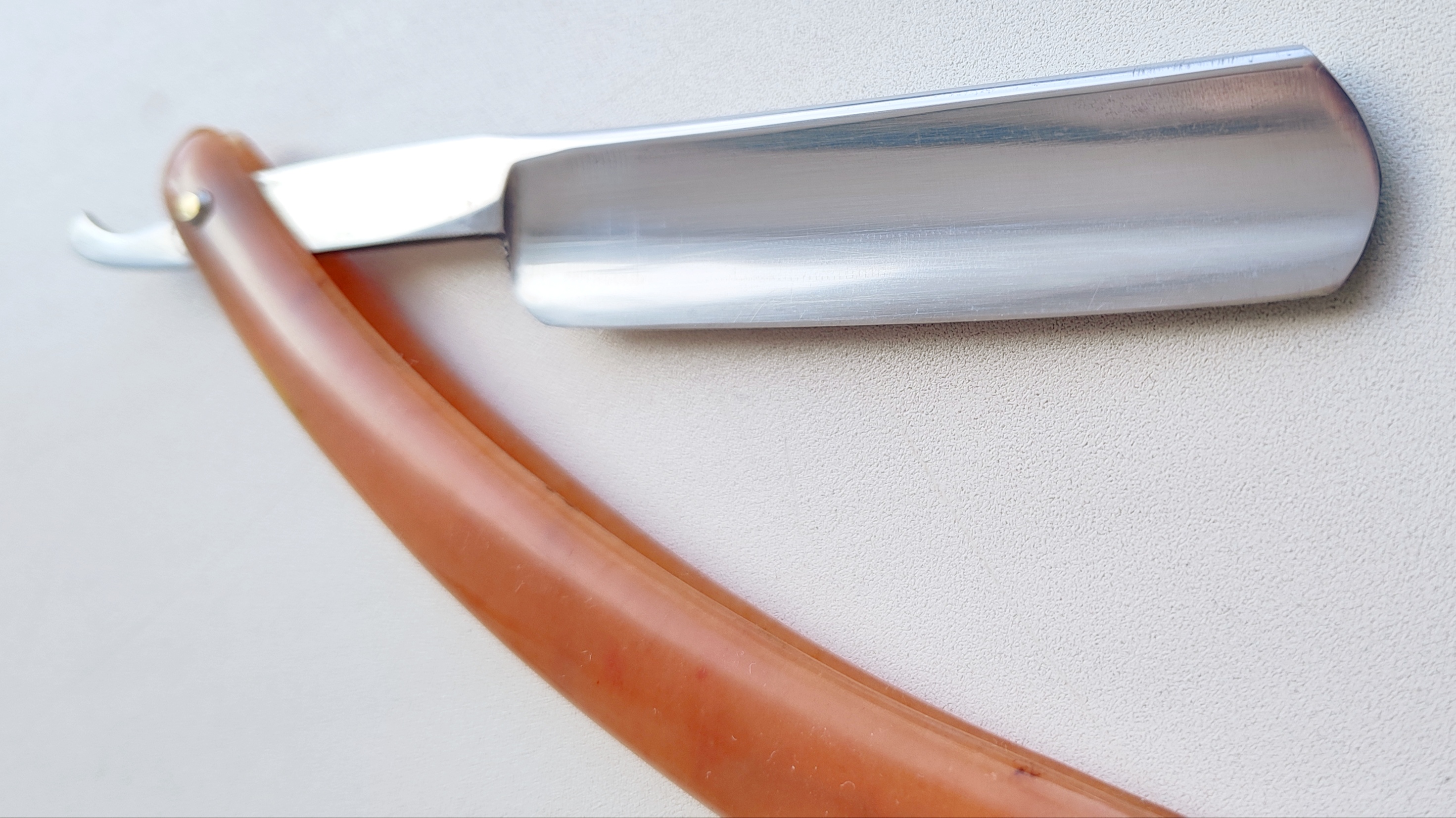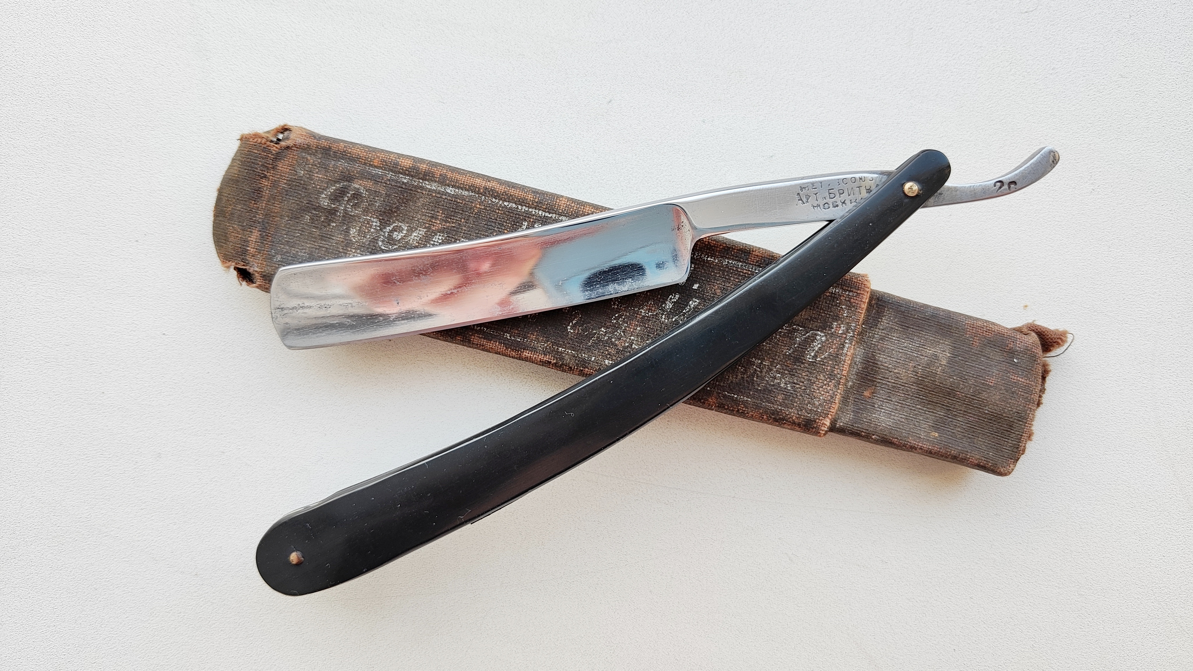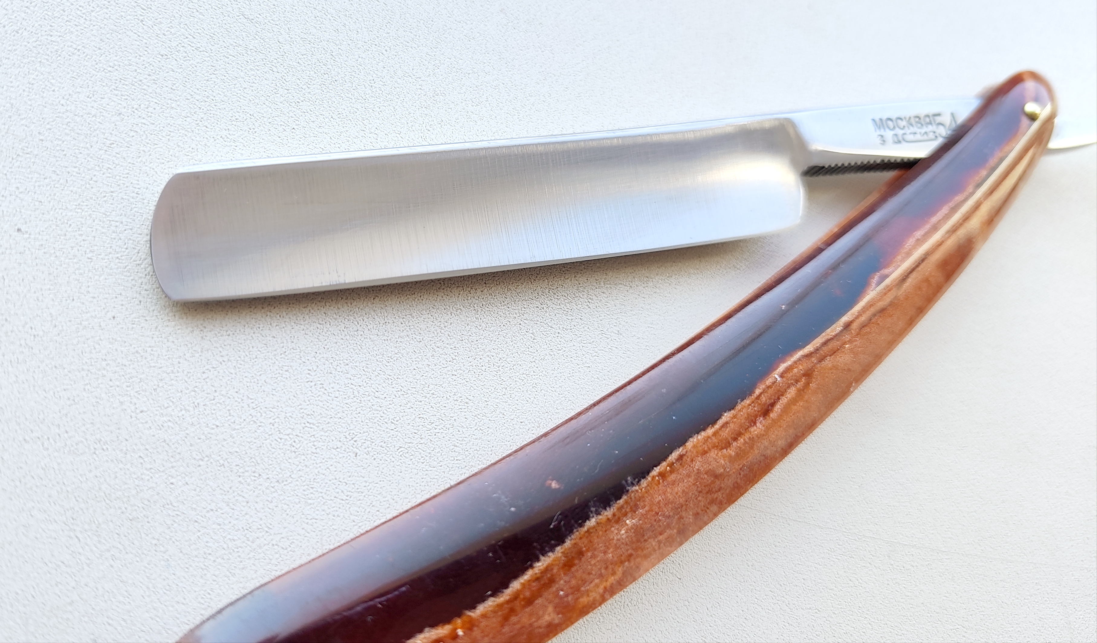 Опасная бритва Москва, завод СТИЗ, 1954 год. Когда то была гравюра на полотне (не знаю какая). Ширина полотна 14 мм у носа с расширением до 15.5 мм к пятке, все родное, без футляра. Ко мне попала со следами старого регринда, прошелся вручную наждачками, полиролью и подготовил к бритью. Остались некоторые остаточные следы от регринда, кромка чистая. Геометрия в порядке, сталь не перегрета, в рабочем плане вполне хороший был регринд. Маленькую трещинку у пина подклеил. Почётный 1954 год, качественная углеродистая сталь, красивая оправа под янтарь/древесину. Отличный вариант попробовать опасное бритье за недорого, когда нужны не шашечки, а просто ехать.