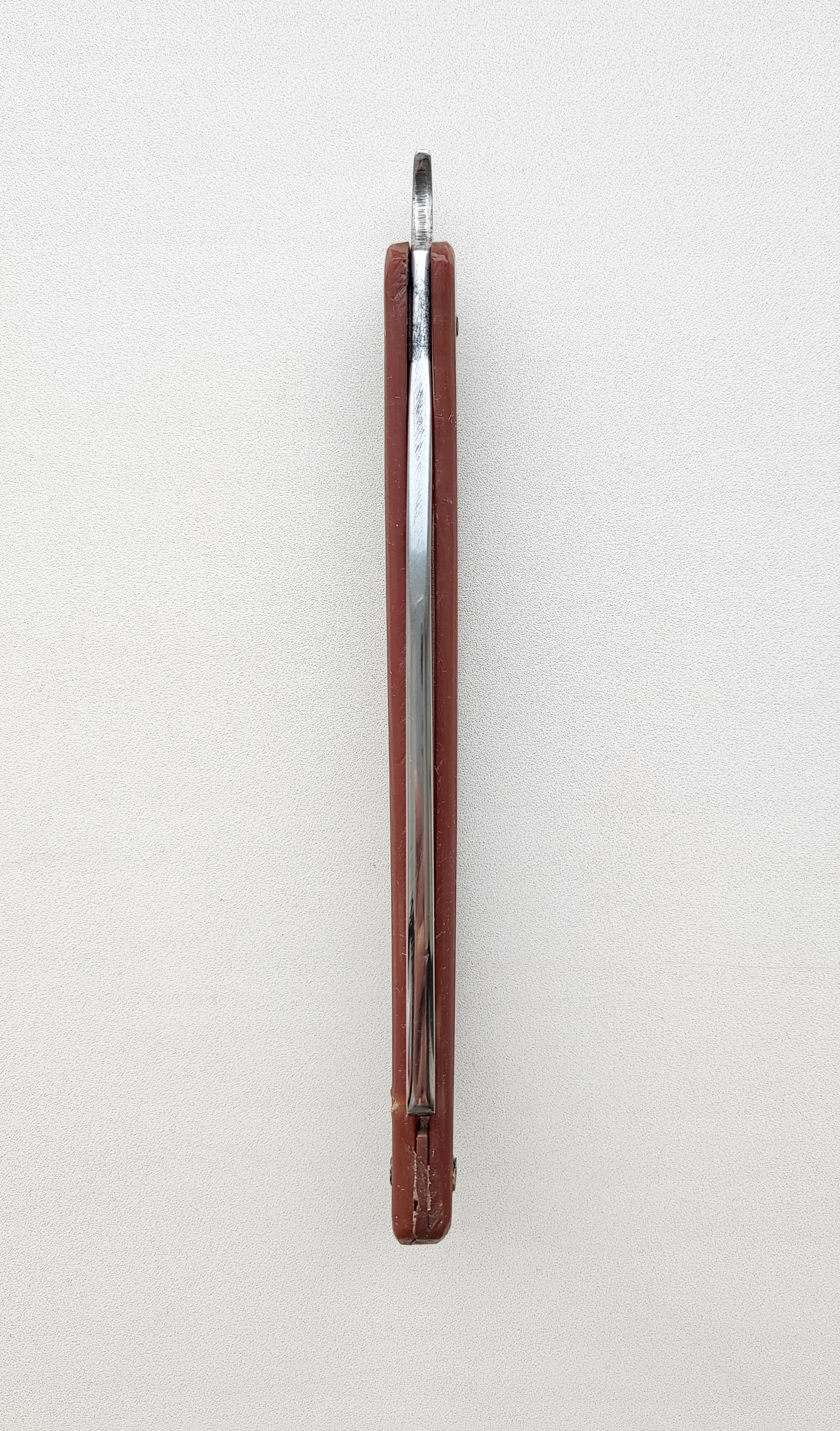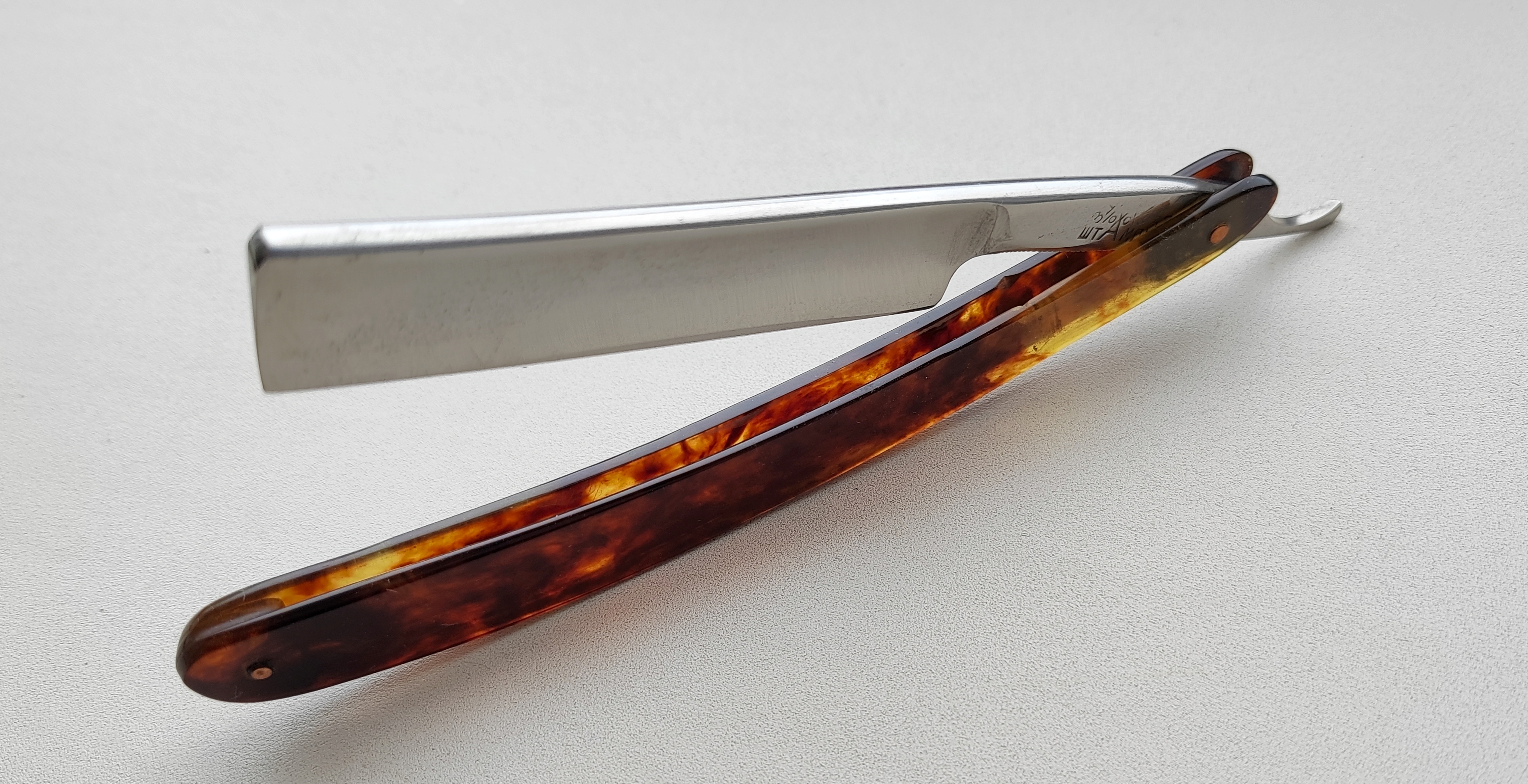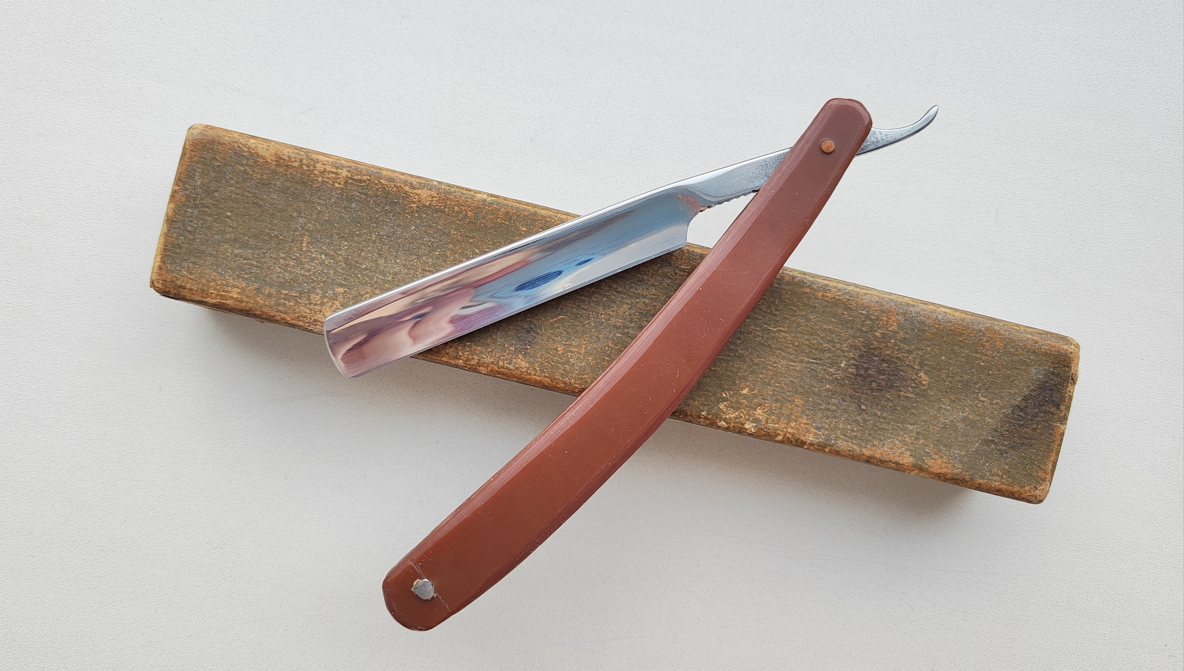 Опасная бритва Москва, завод СТИЗ, 1954 год. Когда то была гравюра на полотне (не знаю какая). Ширина полотна 14 мм у носа с расширением до 15.5 мм к пятке, все родное, без футляра. Ко мне попала со следами старого регринда, прошелся вручную наждачками, полиролью и подготовил к бритью. Остались некоторые остаточные следы от регринда, кромка чистая. Геометрия в порядке, сталь не перегрета, в рабочем плане вполне хороший был регринд. Маленькую трещинку у пина подклеил. Почётный 1954 год, качественная углеродистая сталь, красивая оправа под янтарь/древесину. Отличный вариант попробовать опасное бритье за недорого, когда нужны не шашечки, а просто ехать.