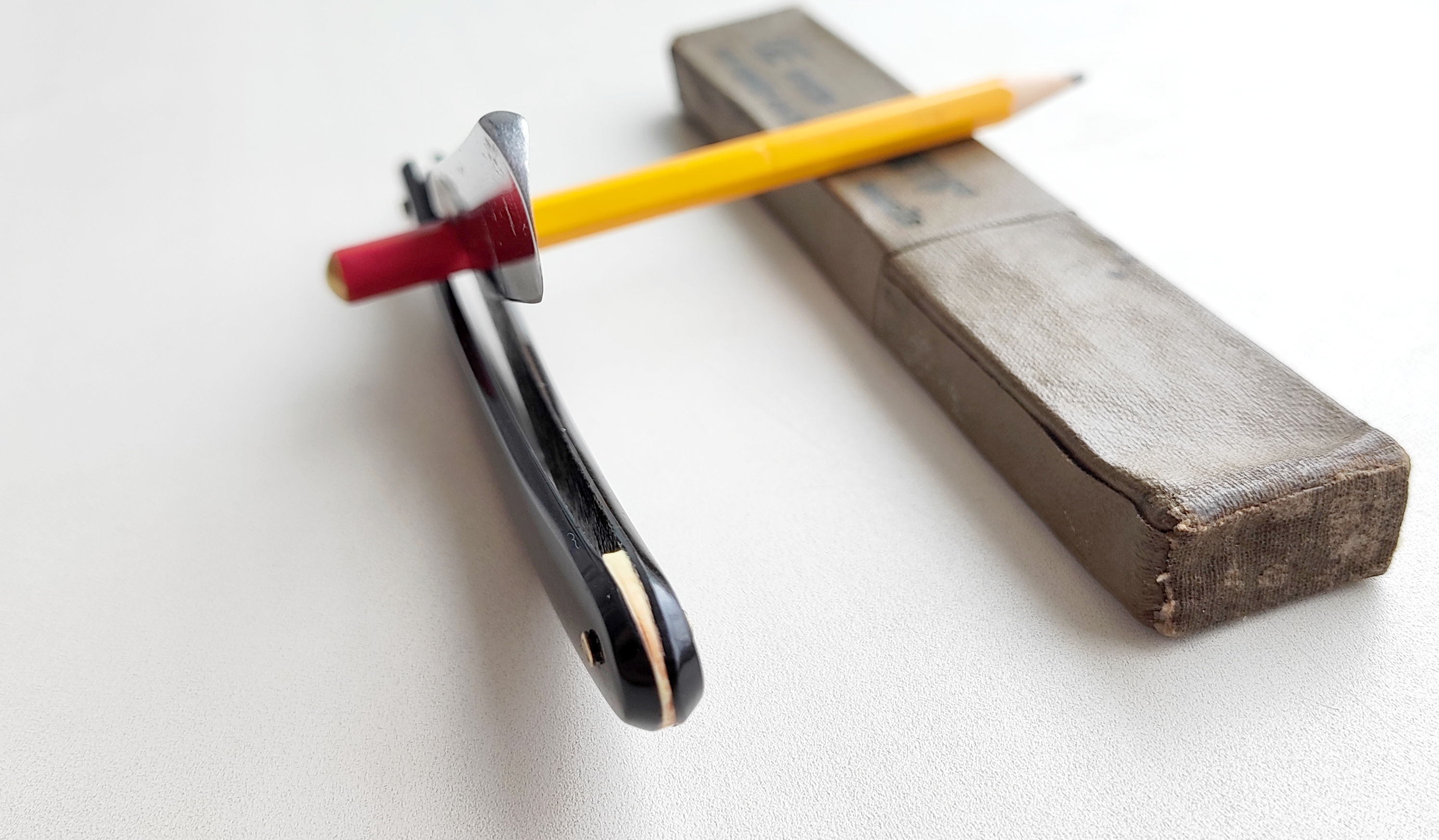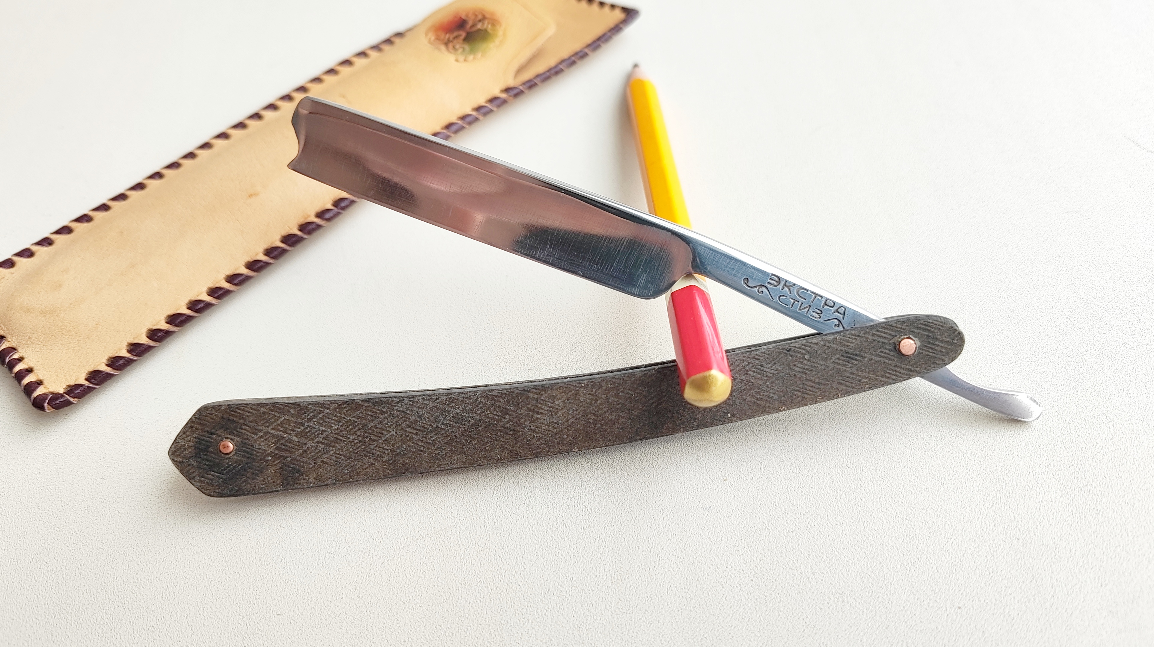 Опасная бритва Экстра, завод СТИЗ, изготовлена в военный период или чуть раньше (39-45 годы). Ширина полотна 14.5 мм, чехол от какой то другой бритвы. Вручную почистил и заточил. Подготовлена мной к бритью. Оправа оригинальная пластиковая с насечкой (к низу чуть с поводкой, но функционирует нормально), сталь старого стандарта, профиль полуклин - то что надо для жесткой щетины. Самая первая версия бритв Экстра, с вензельками на эрле.