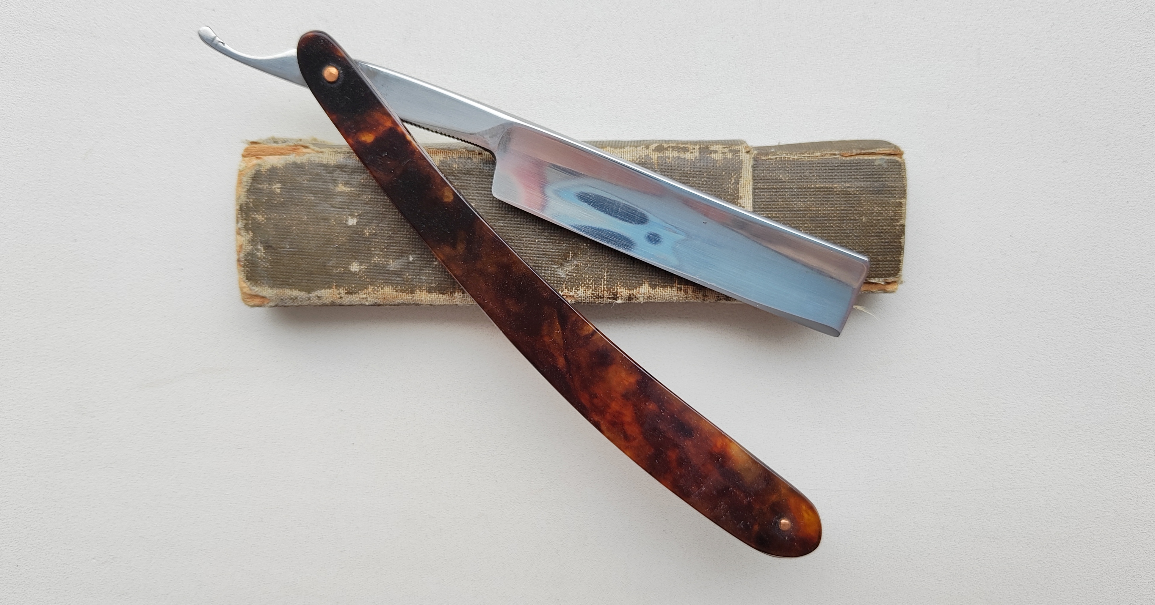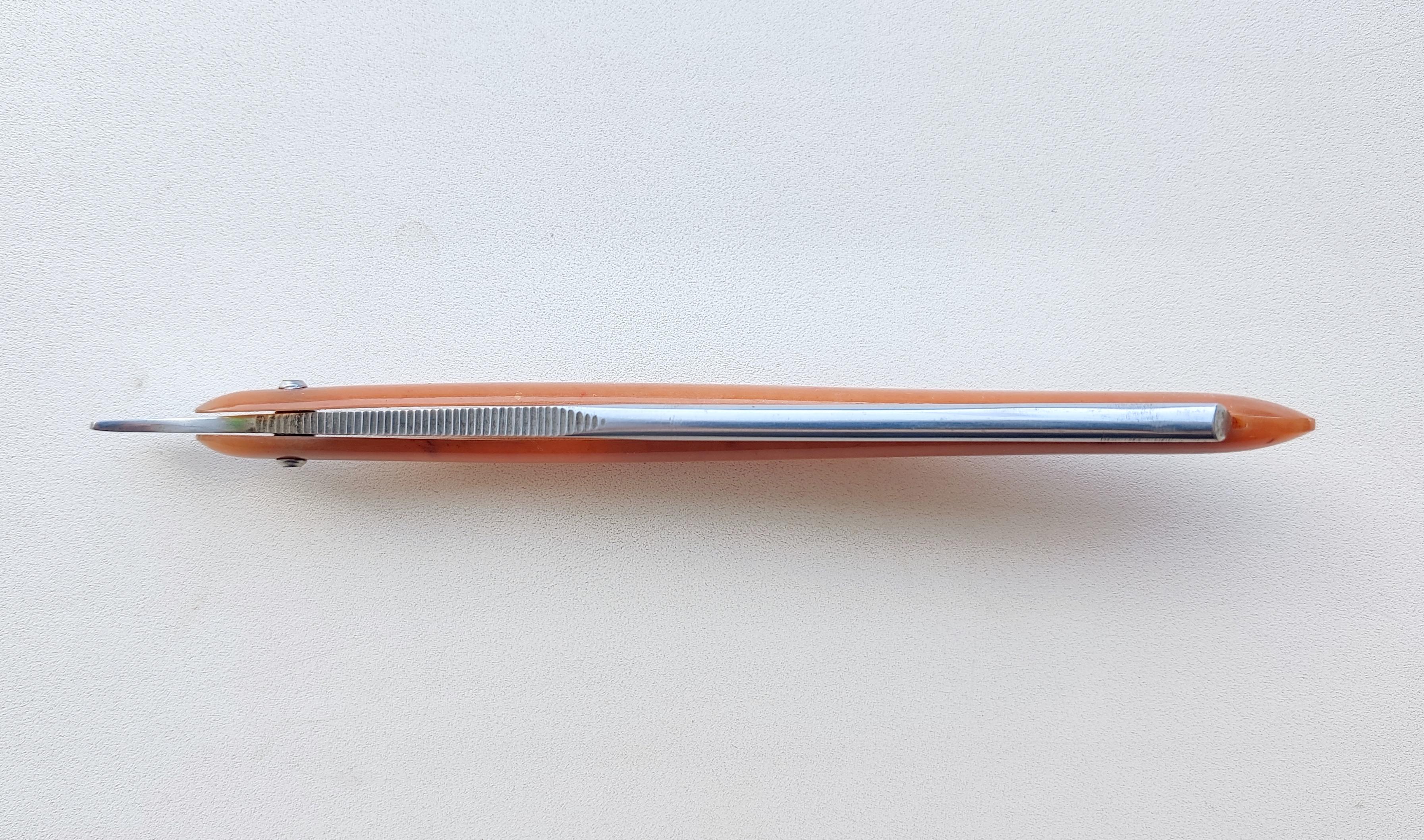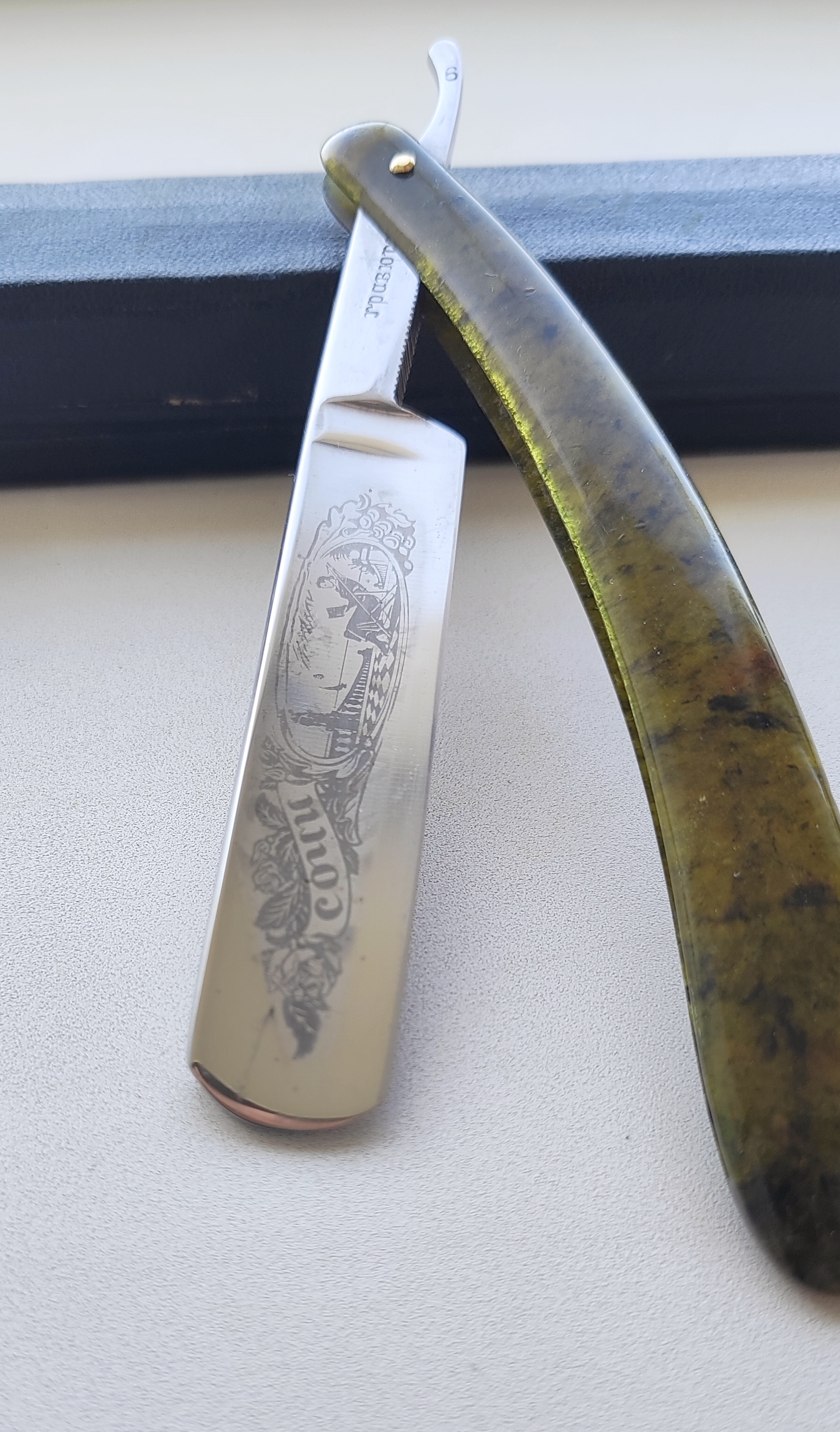 Опасная бритва фабрики Elixio, Solingen (г. Золинген, Германия), первая половина 20 века. Ширина полотна 18 мм, родная оправа была под черепаху и с надписью Solingen, но она растрескалась от возраста и была заменена на оранжевую от ЗТВ Гравюра, без футляра. Подготовлена мной к бритью. Хороший представитель немецкой классики, отличная геометрия, звонкая сталь.