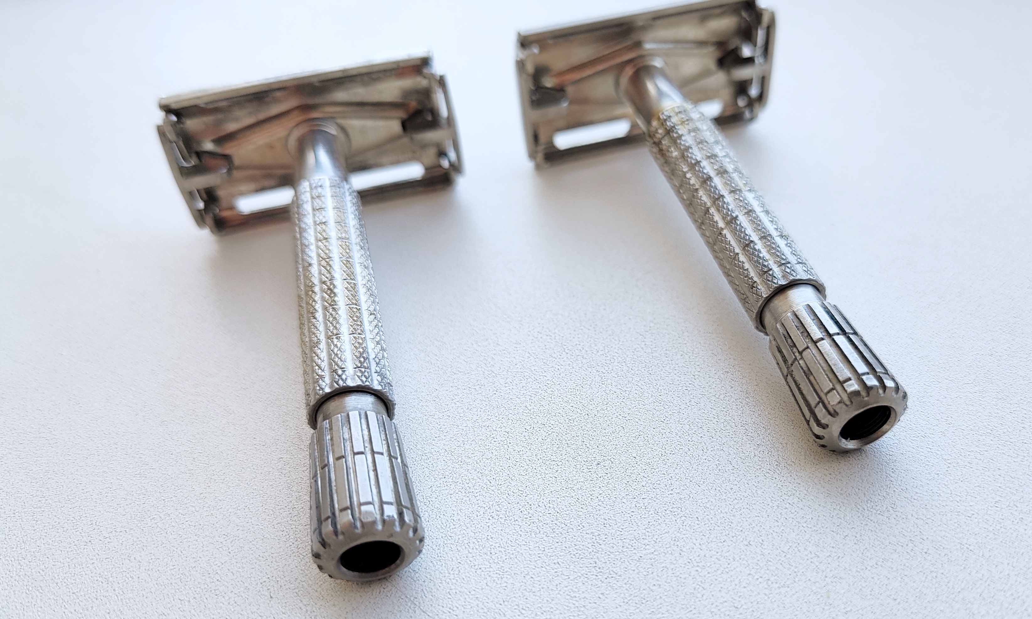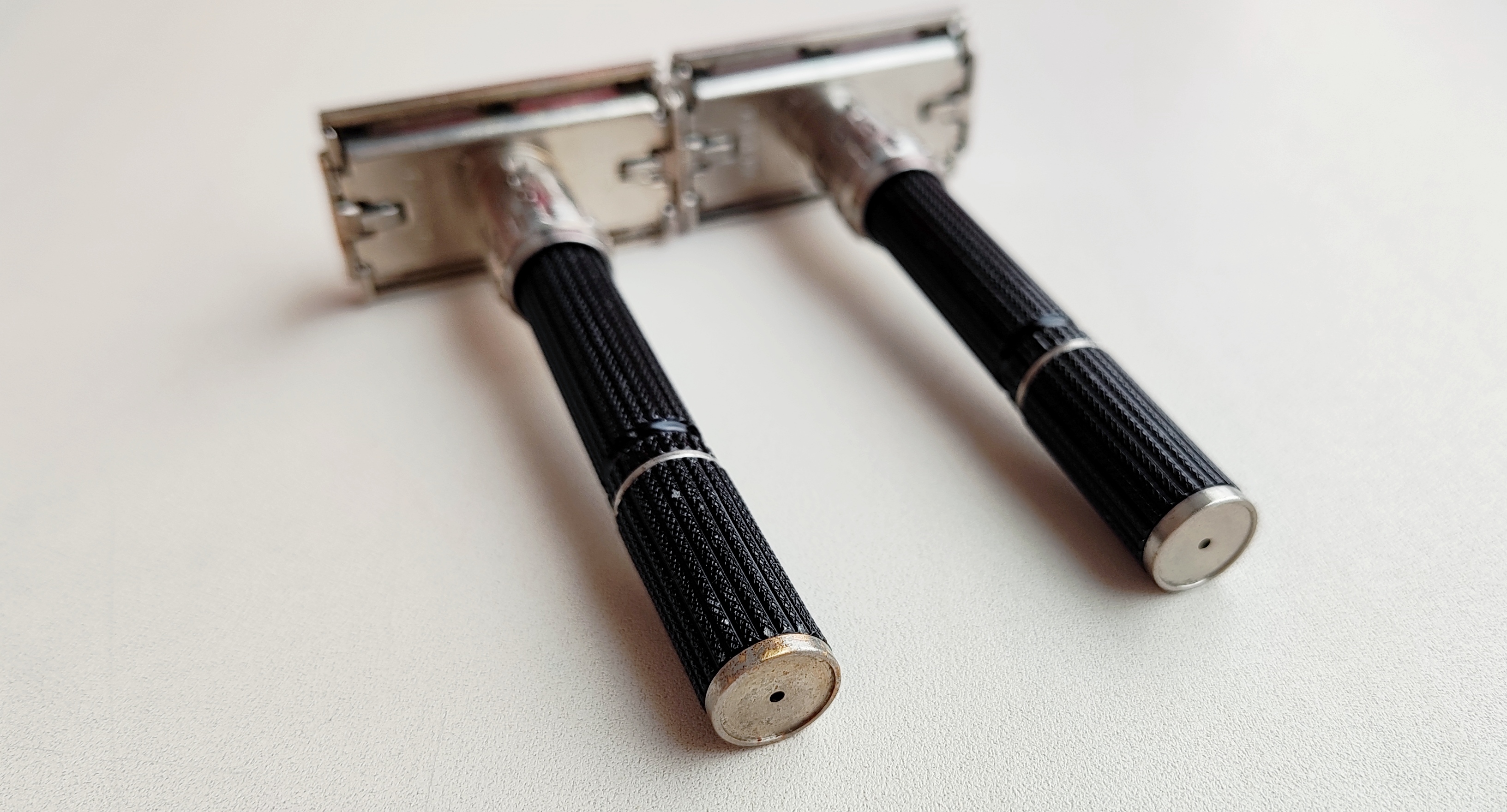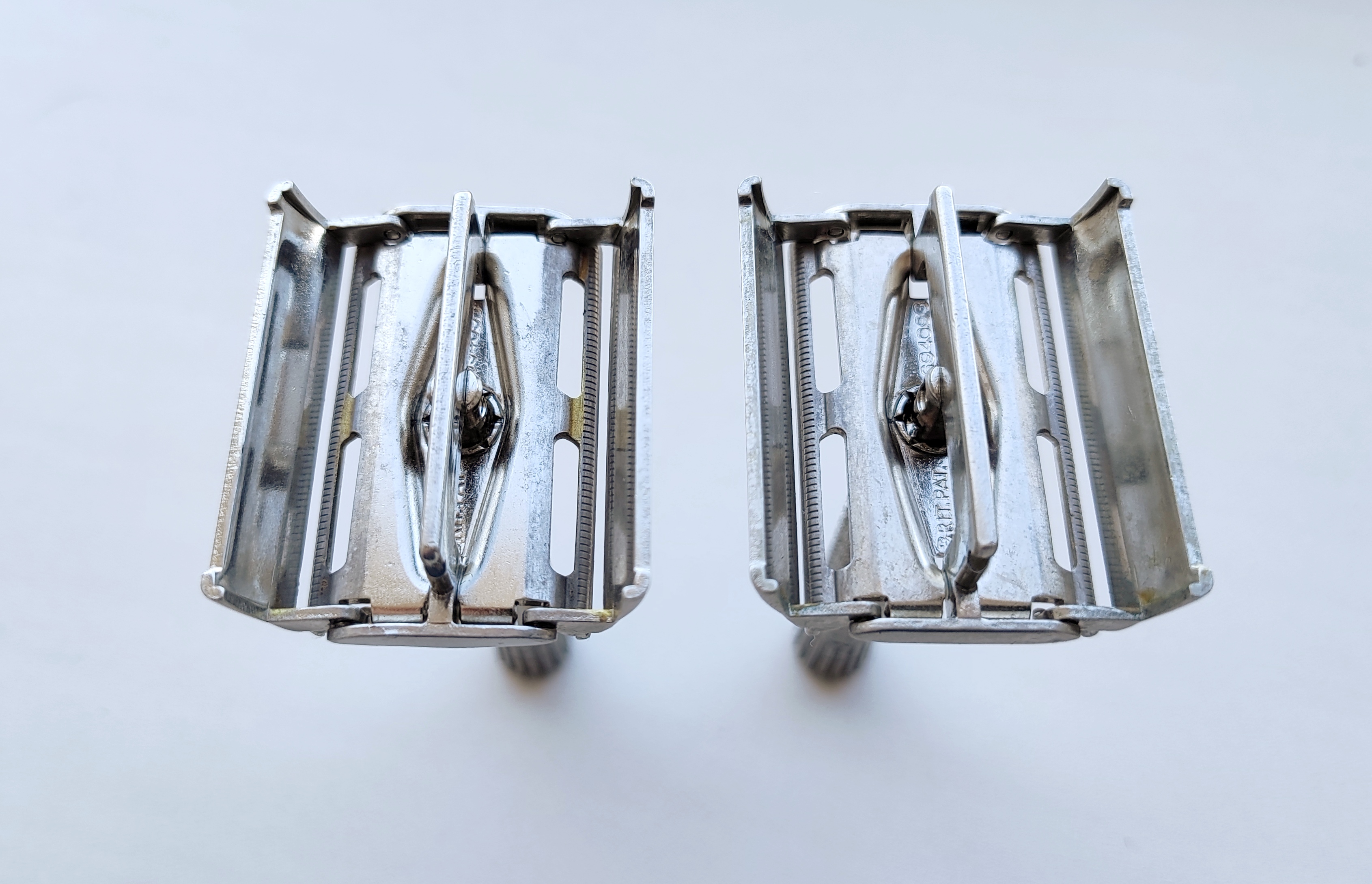 Т-образная безопасная бритва Gillette Rocket Flare Tip, Brit Pat. 694093 / Made in England, конец 50х, начало 60х, Великобритания, конструкция "бабочка", TTO (twist to open - поверните чтобы открыть). В наличии две штуки, станки почистил, внутри и снаружи. Механизмы смазал специальной смазкой, чтобы все крутилось веселее. Механика в отличном виде, открывается/закрывается штатно. Классические бабочки, комфортные и эффективные с острым лезвием. Производились после Gillette Fatboy и в период производства Gillette Slim, но не в США, а в Англии, на их заводе.