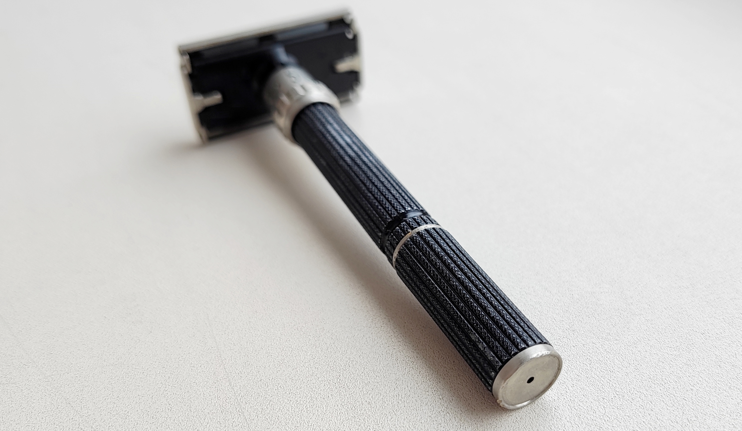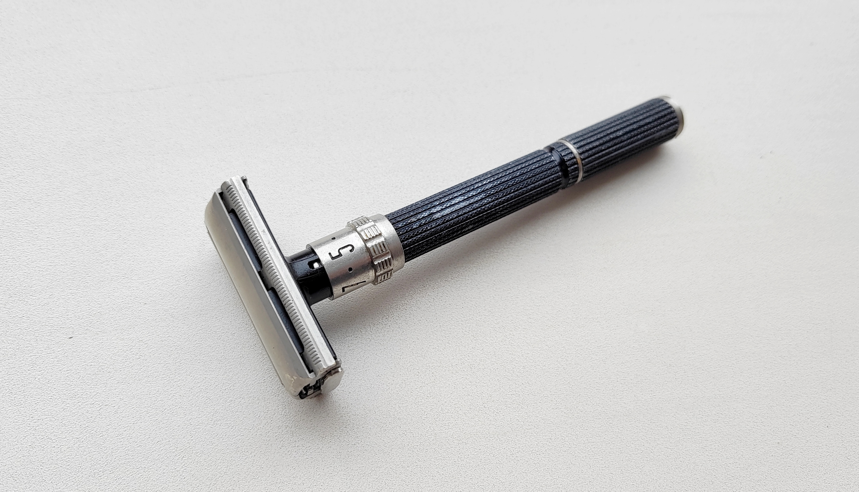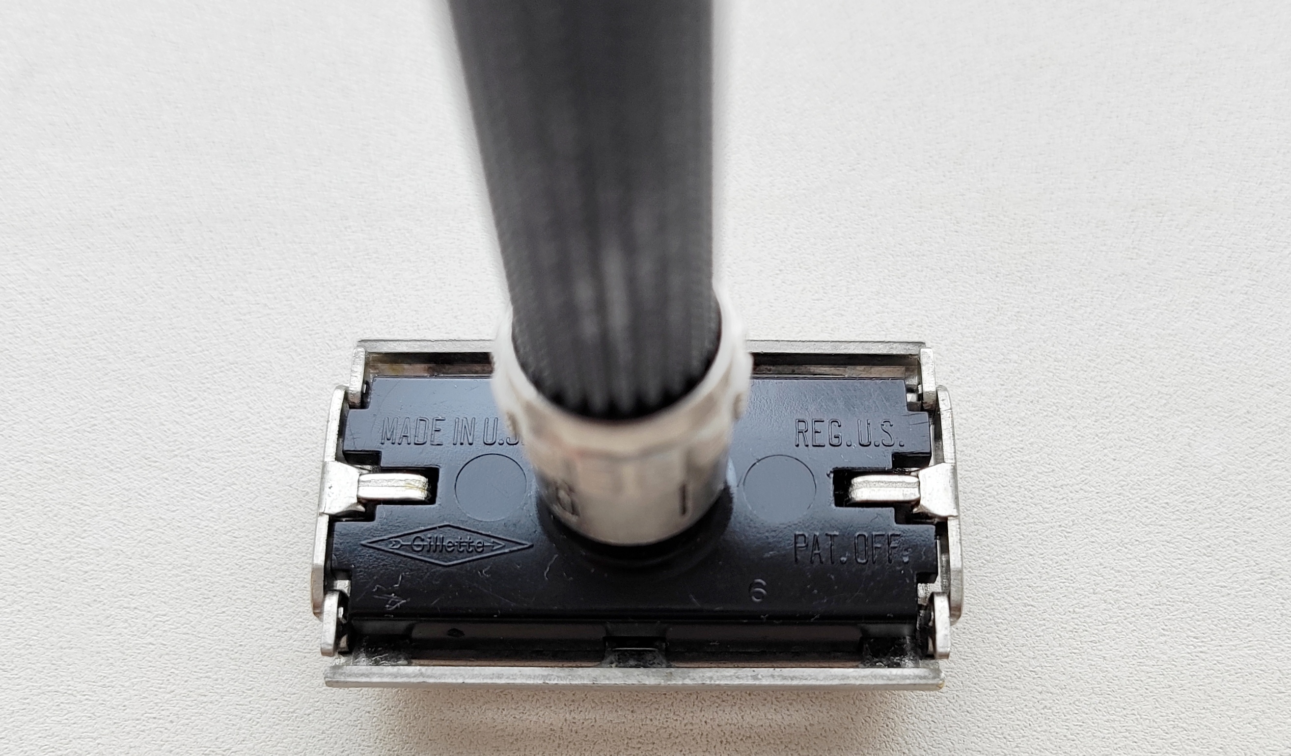 Безопасный регулируемый станок "Чёрная Красавица", можно сказать легенда, более ранняя версия с металлической опорной плитой. К тому же, это модель 84 - длина ручки у нее 85 мм, довольно редкая версия, а первый экземпляр еще и из первых выпусков (код P). Перед данным станком выпускались Gillette Fatboy, Gillette Slim.