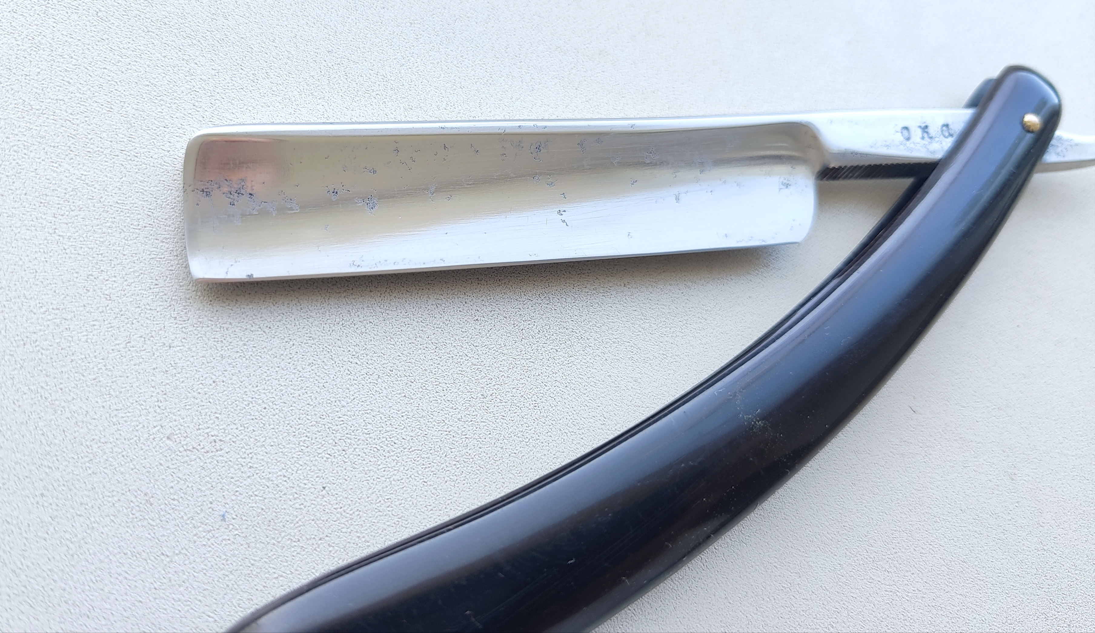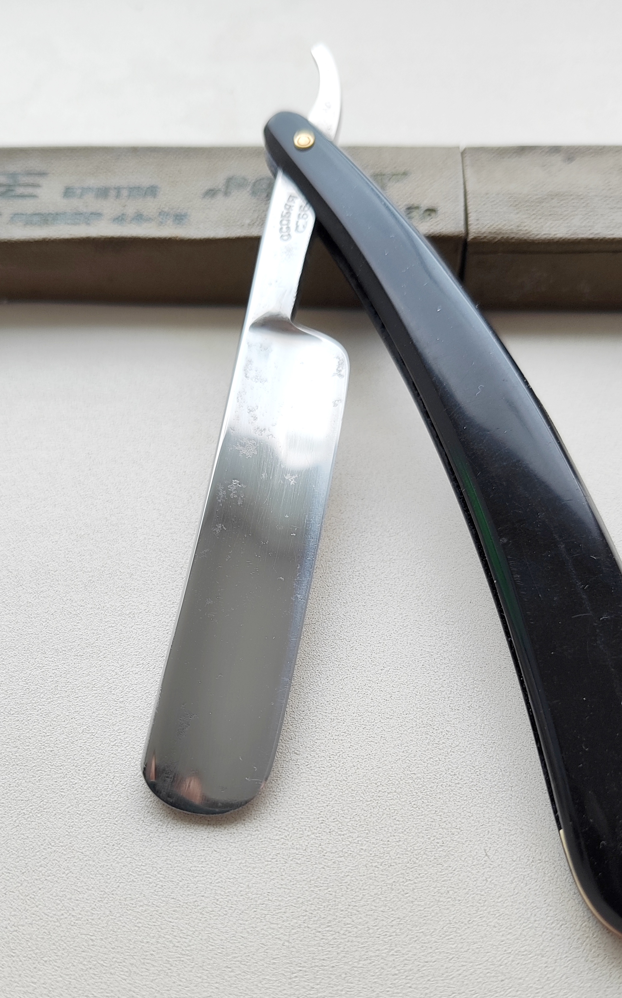 Опасная бритва Особая, завод СТИЗ, 1965 год. Ширина полотна 13.5 мм у носа с расширением до 15 мм к пятке, все родное, без футляра. Ко мне попала со следами старого регринда, прошелся вручную наждачками, полиролью и подготовил к бритью. Остались некоторые остаточные следы от регринда, кромка чистая. Геометрия в порядке, сталь не перегрета, в рабочем плане вполне хороший был регринд. Особая очень ценилась среди советских парикмахеров за отличные рабочие качества. Отличный вариант попробовать опасное бритье за недорого.