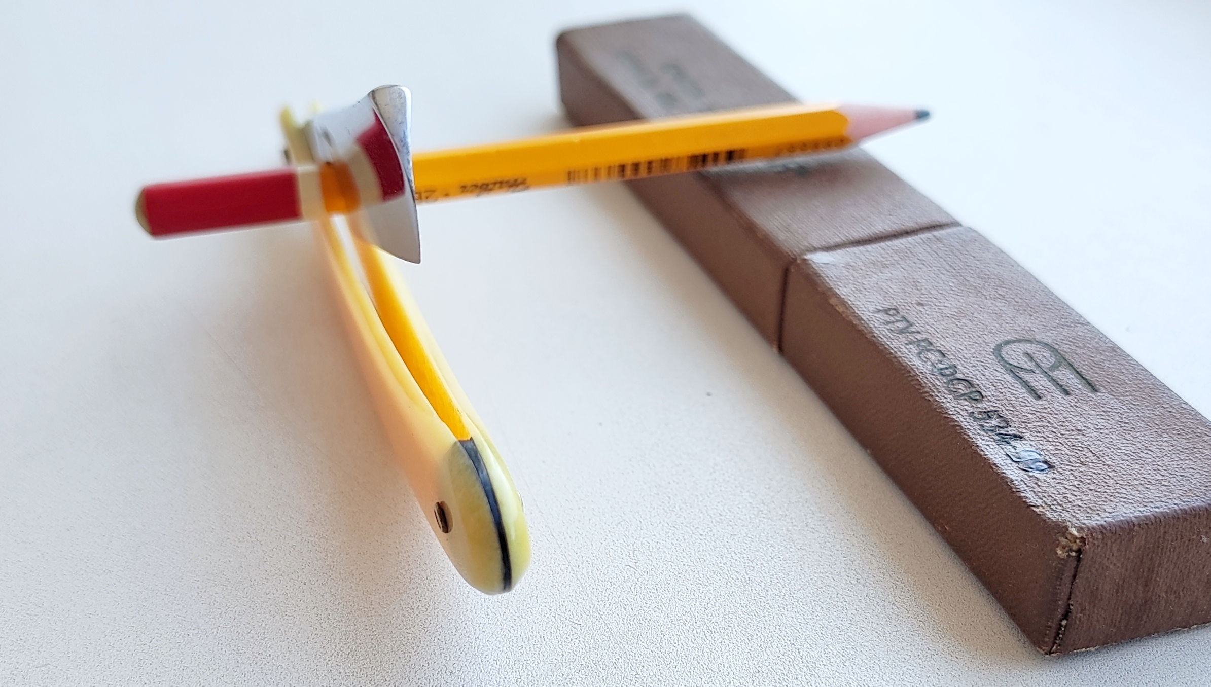 Опасная бритва Экстра, завод СТИЗ, изготовлена в военный период или чуть раньше (39-45 годы). Ширина полотна 14.5 мм, чехол от какой то другой бритвы. Вручную почистил и заточил. Подготовлена мной к бритью. Оправа оригинальная пластиковая с насечкой (к низу чуть с поводкой, но функционирует нормально), сталь старого стандарта, профиль полуклин - то что надо для жесткой щетины. Самая первая версия бритв Экстра, с вензельками на эрле.