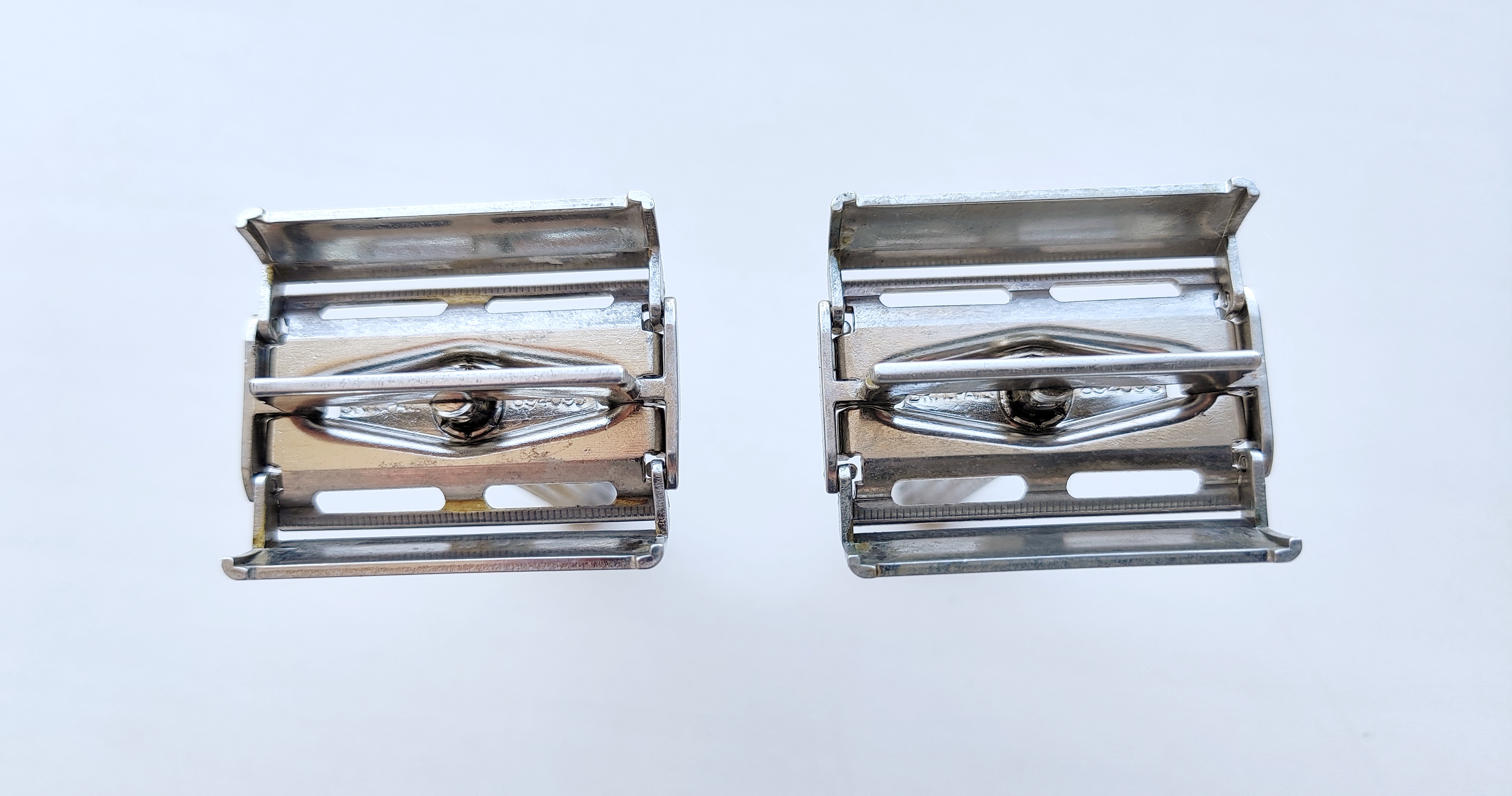Т-образная безопасная бритва Gillette Rocket Flare Tip, Brit Pat. 694093 / Made in England, конец 50х, начало 60х, Великобритания, конструкция "бабочка", TTO (twist to open - поверните чтобы открыть). В наличии две штуки, станки почистил, внутри и снаружи. Механизмы смазал специальной смазкой, чтобы все крутилось веселее. Механика в отличном виде, открывается/закрывается штатно. Классические бабочки, комфортные и эффективные с острым лезвием. Производились после Gillette Fatboy и в период производства Gillette Slim, но не в США, а в Англии, на их заводе.