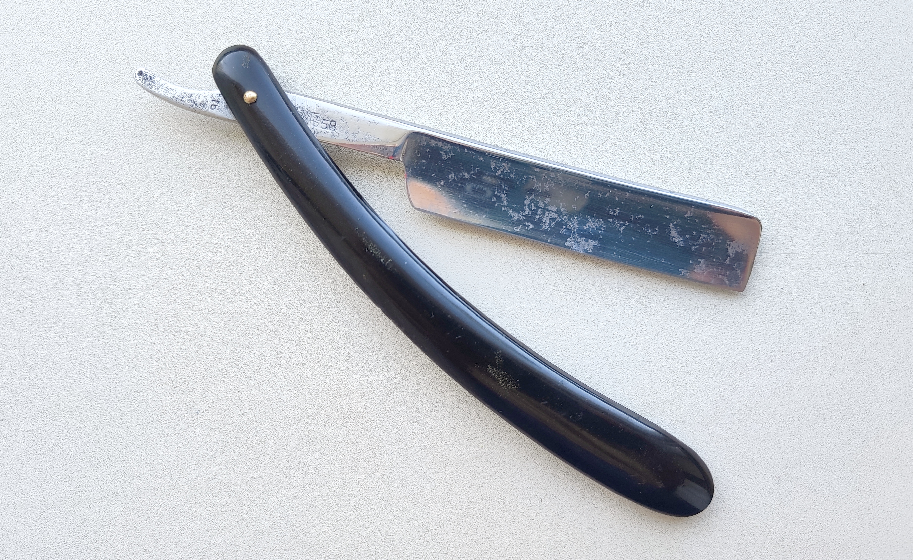 Опасная бритва Москва, завод СТИЗ, 1954 год. Когда то была гравюра на полотне (не знаю какая). Ширина полотна 14 мм у носа с расширением до 15.5 мм к пятке, все родное, без футляра. Ко мне попала со следами старого регринда, прошелся вручную наждачками, полиролью и подготовил к бритью. Остались некоторые остаточные следы от регринда, кромка чистая. Геометрия в порядке, сталь не перегрета, в рабочем плане вполне хороший был регринд. Маленькую трещинку у пина подклеил. Почётный 1954 год, качественная углеродистая сталь, красивая оправа под янтарь/древесину. Отличный вариант попробовать опасное бритье за недорого, когда нужны не шашечки, а просто ехать.