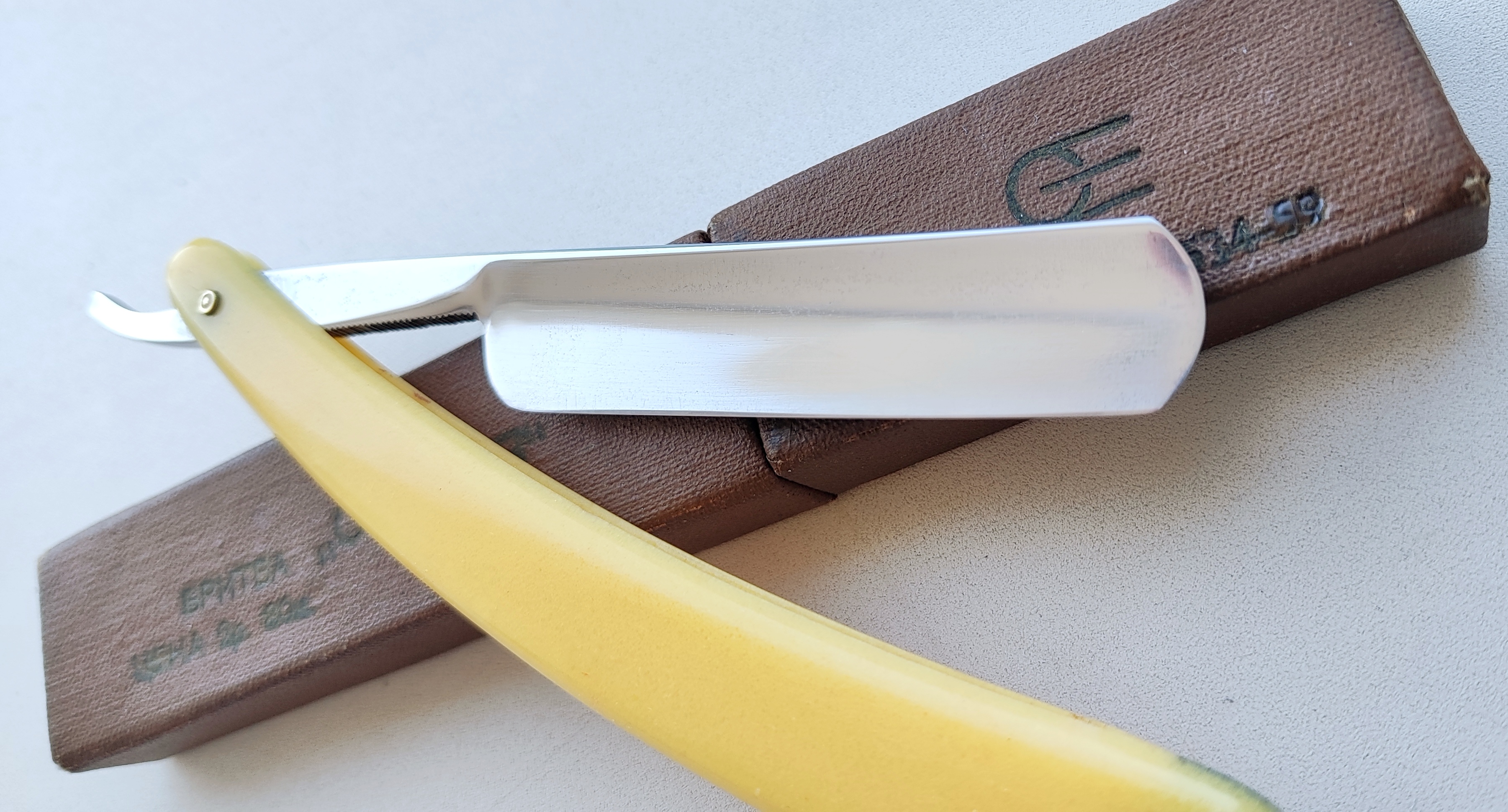 Опасная бритва Экстра, завод СТИЗ, изготовлена в военный период или чуть раньше (39-45 годы). Ширина полотна 14.5 мм, чехол от какой то другой бритвы. Вручную почистил и заточил. Подготовлена мной к бритью. Оправа оригинальная пластиковая с насечкой (к низу чуть с поводкой, но функционирует нормально), сталь старого стандарта, профиль полуклин - то что надо для жесткой щетины. Самая первая версия бритв Экстра, с вензельками на эрле.