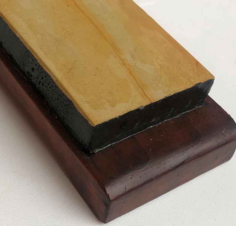 Камень из старой японской парикмахерской.Высокого качества.Притерт. Очень твердый и практически не выдаёт собственной суспензии, но прекрасно работает с Асано нагурами разной зернистости. Очень тонко работает, быстро выглаживается и начинает "зеркалить". Фирменный характер торцевого распила. Торца и обратная сторона покрыты лаком в три слоя.Родная деревянная подставка приведена в порядок и покрыта датским маслом, для красоты.