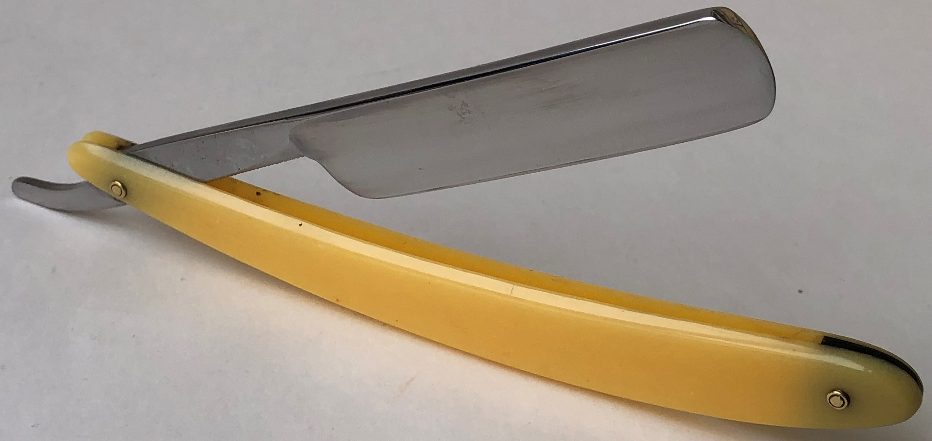 Скорее всего бритва немецкая,но установленная роговая оправа и родные пины мне напомнили классических англичан 19-го века. Поэтому на 100% точно тут сказать не могу.