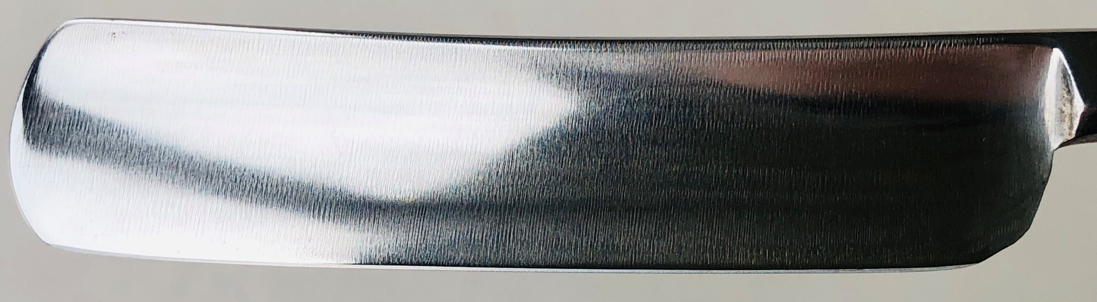 Бритва была разобрана, клинок по мере возможности приведён в порядок.Умеренная полировка. Кромочка немного широковата,но почти равномерна по всей длине полотна.Новые двух-цветные втулки и внутренние шайбы. Родная роговая оправа в хорошем состоянии,без критичных дефектов,но нужно сделать скидку на преклонный возраст материала.Но, внешних расслоений, трещин и разгрызанных мест нет.Удобная форма лезвия клинка. Бритва достаточно тяжёлая.