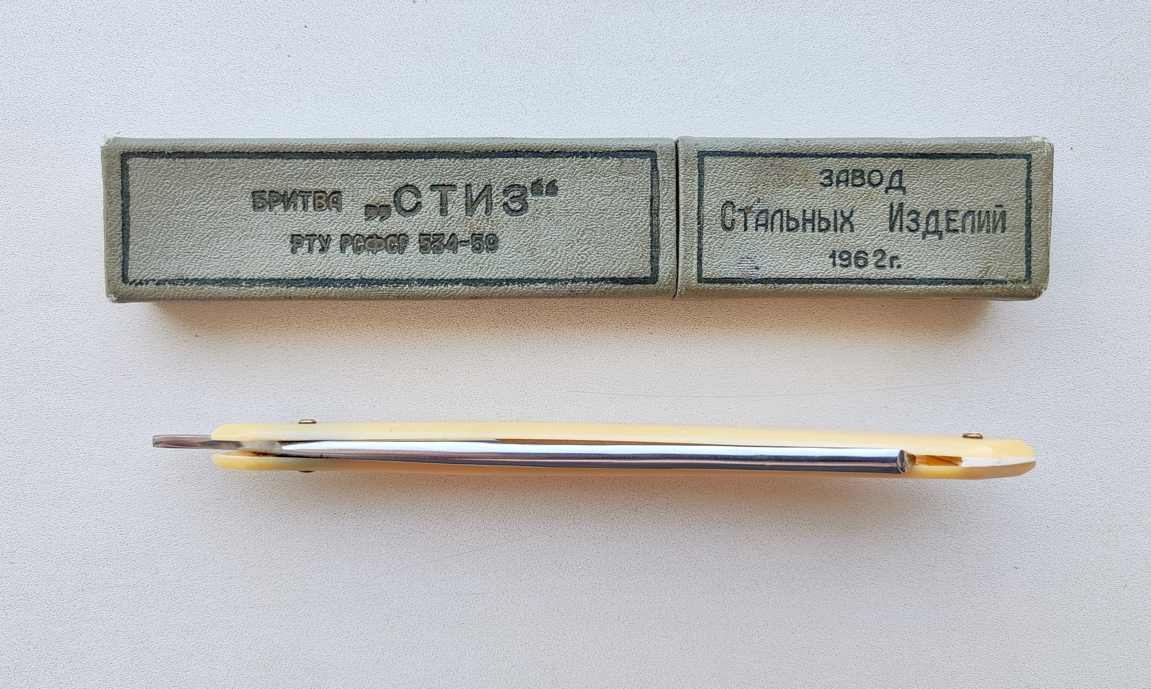 Опасная бритва "СТИЗ", завод СТИЗ, 1962 год. Гравировка на полотне "СТИЗ с вензелями". Ширина полотна 15.5 мм, все родное, футляр тоже. Пришла с заводской заточкой и с лёгкими следами окисления, полотно с небольшой заводской поводкой, но заточилась штатно. Почистил вручную пастами с сохранением травления и заточил, подготовлена мной к бритью.