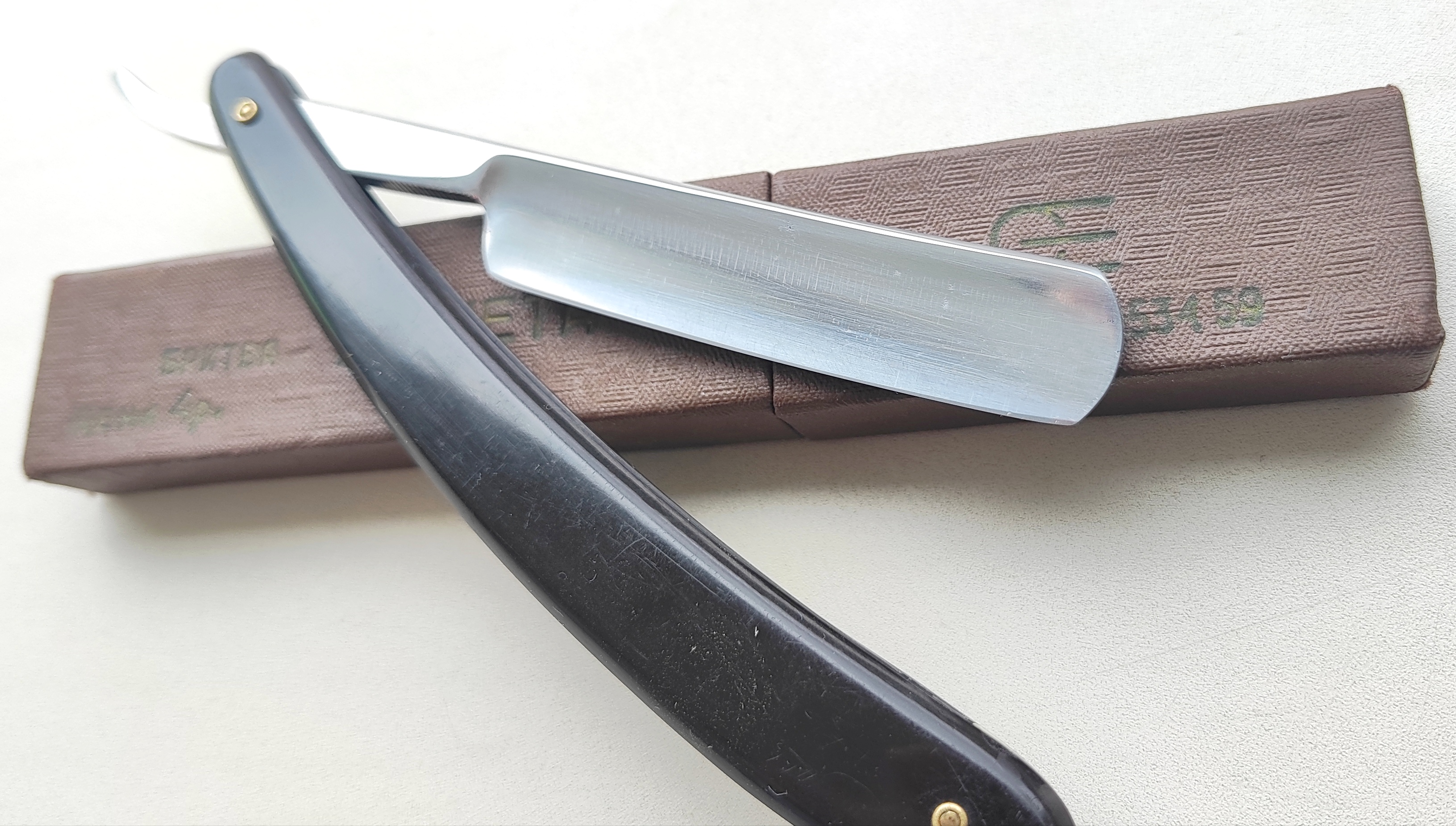 Опасная бритва Яхта, завод ЗТВ (Вача), 1955 год. Ширина полотна 17.5 мм, все родное, футляр тоже. Пришла практически не точеная, но в коррозии. Полотно бритвы вручную почистил и заточил (остались некоторые следы, но кромка чистая). Подготовлена мной к бритью. Приятный экземпляр с передового завода Труд Вача, отличная сталь, Яхта все таки. Хорошая геометрия, удобная форма, двухпиновая оправа. В советские годы это была одна из наиболее почитаемых серийных моделей. Ещё первая более ранняя версия Яхты - с прямым носом.