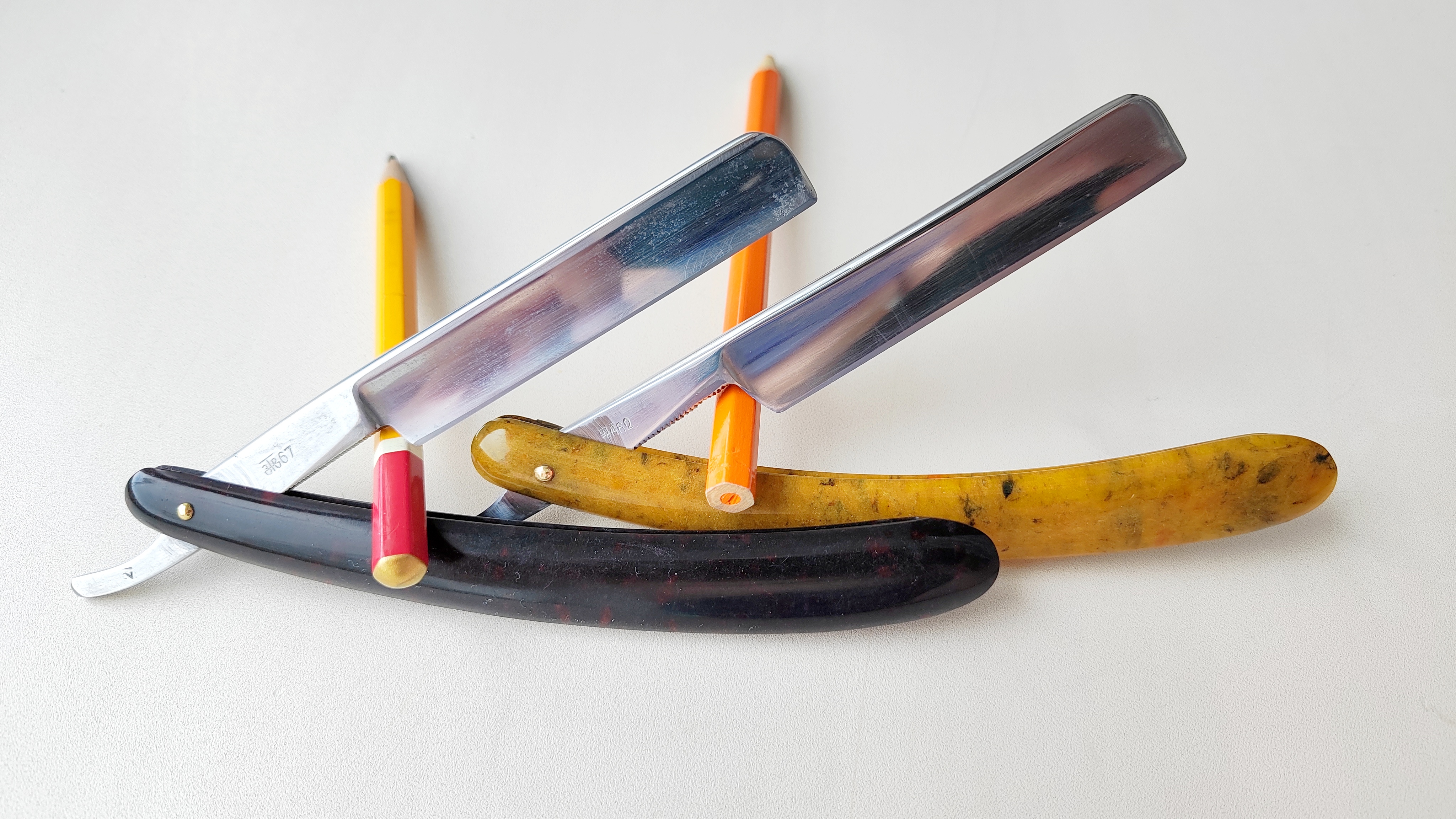 Опасная бритва Ока (в наличии 2 штуки), завод ЗТВ (Вача), 1962 и 1967 годы. Ширина полотна каждой - 15 мм, все родное, без футляров. Бритвы попали ко мне с уточенностями, вручную почистил и заточил. Подготовлены мной к бритью. Ока - бритва из водной серии, куда еще входили Кама, Волга, Яхта. Прямой нос и прямая линия кромки с небольшой шириной полотна - хорошо подойдут для окантовки бороды.