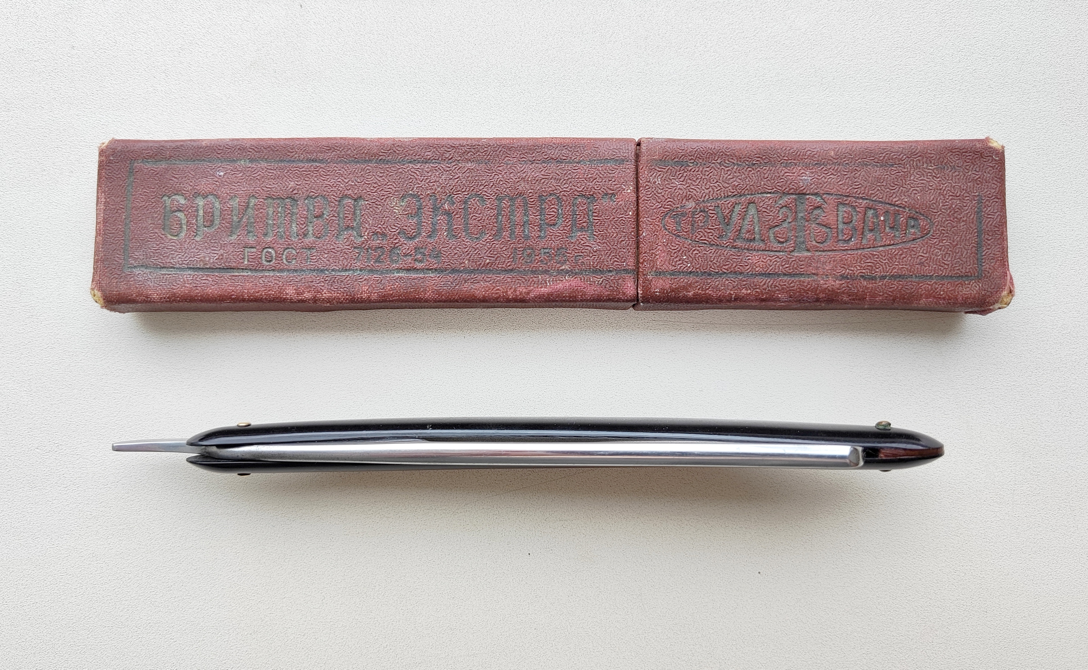 Опасная бритва Экстра, завод Труд Вача (ЗТВ), 1954 год. Ширина полотна 18 мм, двухпиновая оправа, все родное, в т.ч. футляр. Бритву вручную почистил и заточил. Подготовлена мной к бритью. Широкое полотно, удобная форма, достойная углеродка.