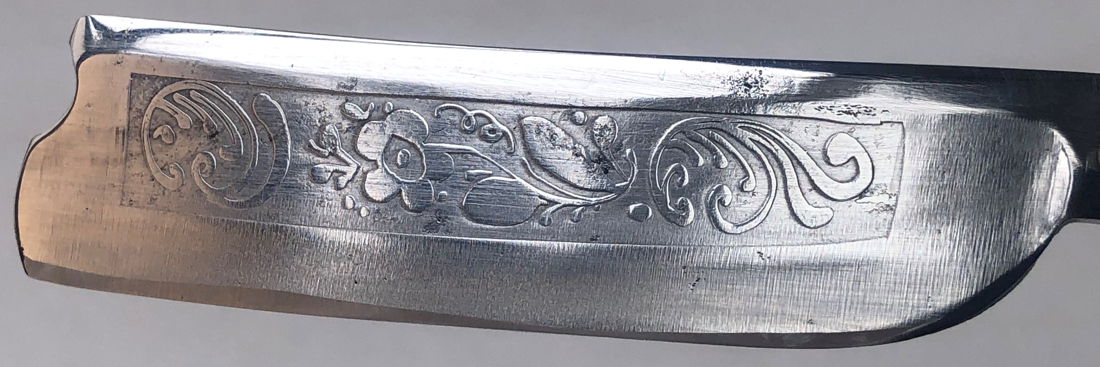 Бритва была без утОчки обушков от заточных камней,что может дать мне предположение, что в пользовании не была. Имели место быть вековые "следы времени" в виде коррозии и окисления на полотнах. Была проведена кропотливая работа для приведения клинков в нормальное состояние, без лишних утрат металла, а также с максимальным сохранением родной гравировки.