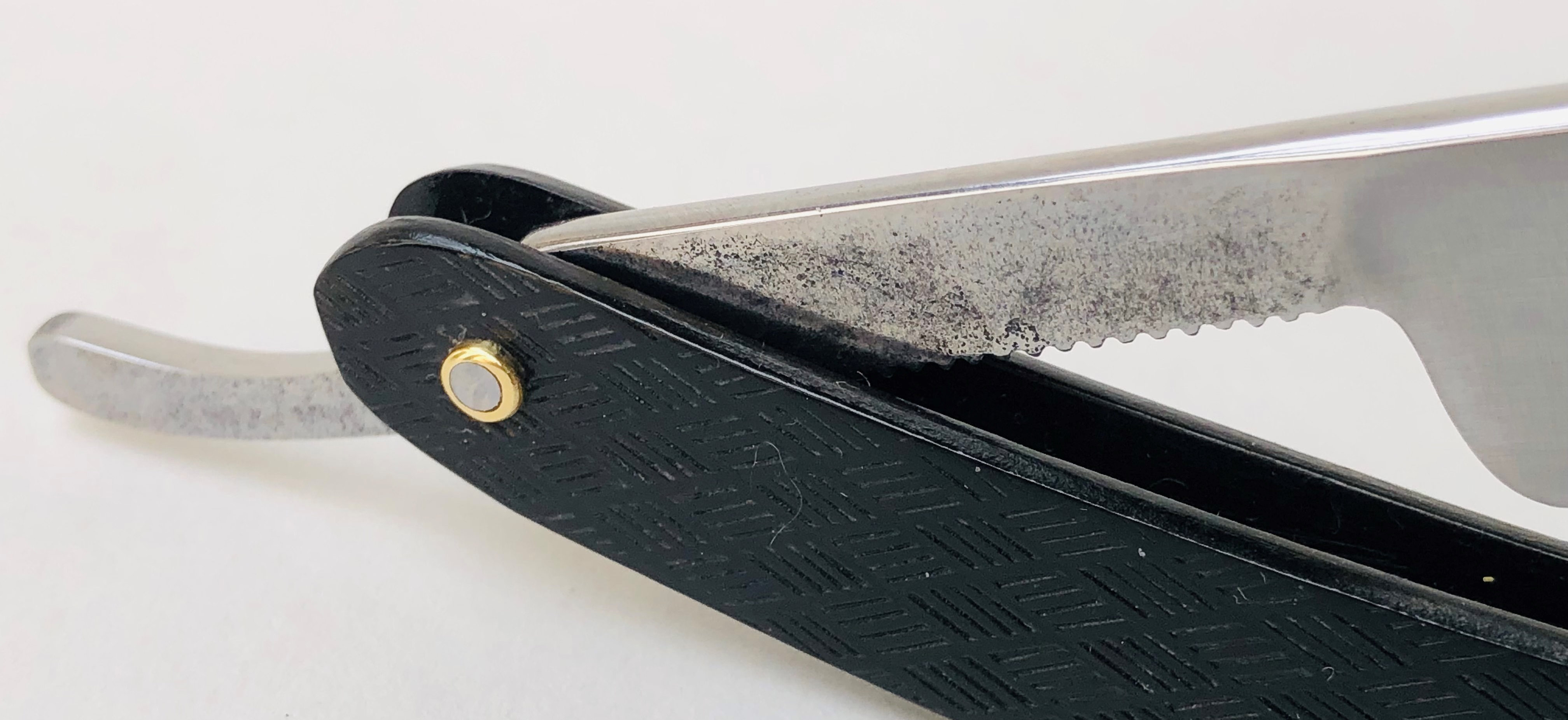 Бритва в пользовании не была. Была заточена впервые. Ничего не разбиралось и не ремонтировалось. Все в оригинальном виде.Идеальная геометрия полотна:кромочка равномерна по всей длине и еле заметна.Нетронутая позолота на травлении. Высококачественная "звонкая" углеродистая сталь.