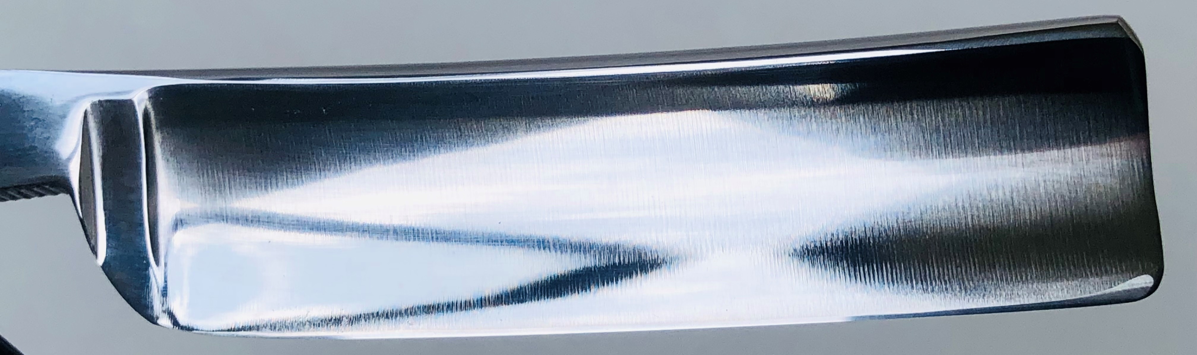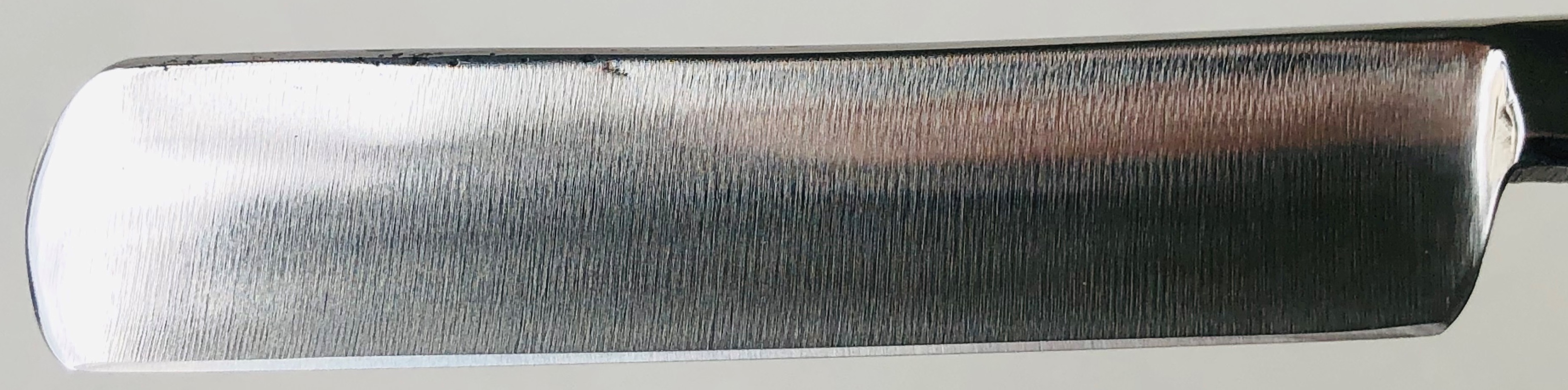Разобрал, для удаления окисления в районе осевого пина и царапин на полотне.Минимальная шлифовка и полировка. Идеальная геометрия клинка:кромочка равномерна по всей длине.Заточена и готова к бритью.
