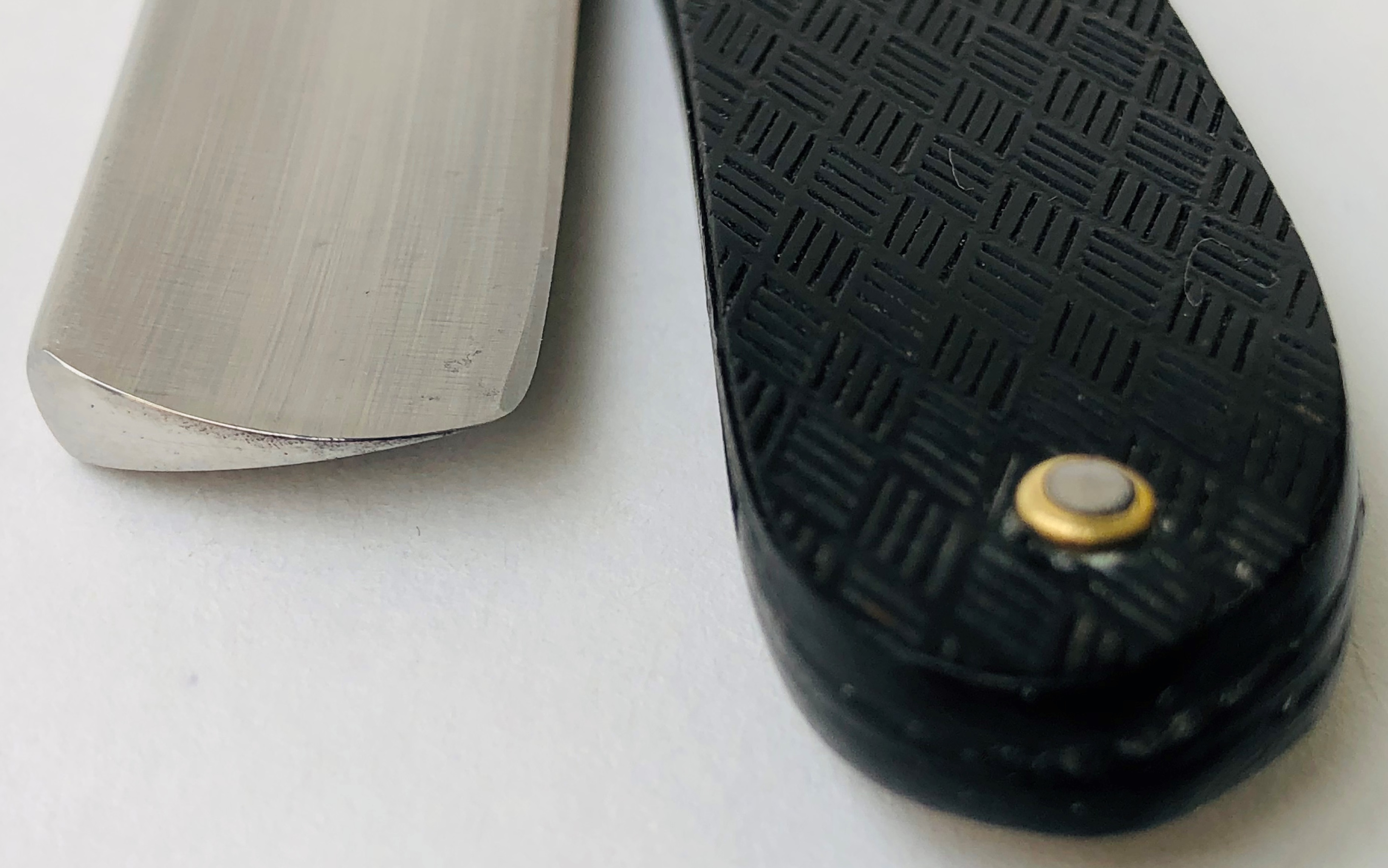 Разобрал, для удаления окисления в районе осевого пина и царапин на полотне.Минимальная шлифовка и полировка. Идеальная геометрия клинка:кромочка равномерна по всей длине.Заточена и готова к бритью.