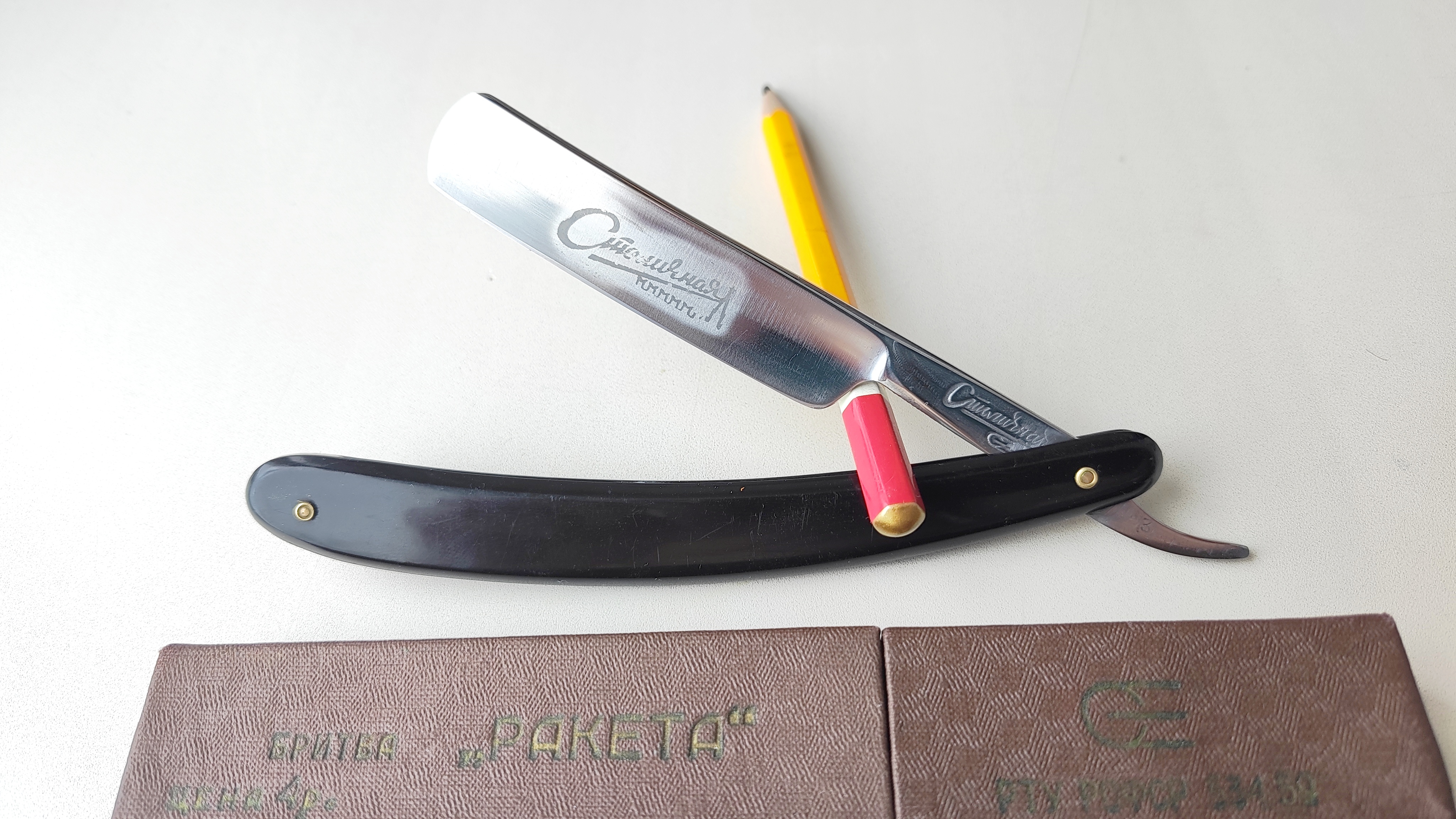 Опасная бритва Столичная, завод СТИЗ, 1973-75 год. Ширина полотна 17 мм, гравюра на полотне "Столичная" и кремлевская стена, все родное, футляр от бритвы СТИЗ Ракета. Пришла с заводской заточкой и мелкими следами коррозии. Почистил вручную и заточил, подготовлена мной к бритью. Столичная пришла на смену Москве, выпускалась в 60х и первой половине 70х годов, хромистая сталь. Значок спутника на эрле без года, такое исполнение было с 73 по 75 год. Сталь очень даже (присутствует легирование, которое было прописано в ГОСТе того времени), в разы качественнее более поздних бритв с эрлями без клейм и надписями на самой оправе.