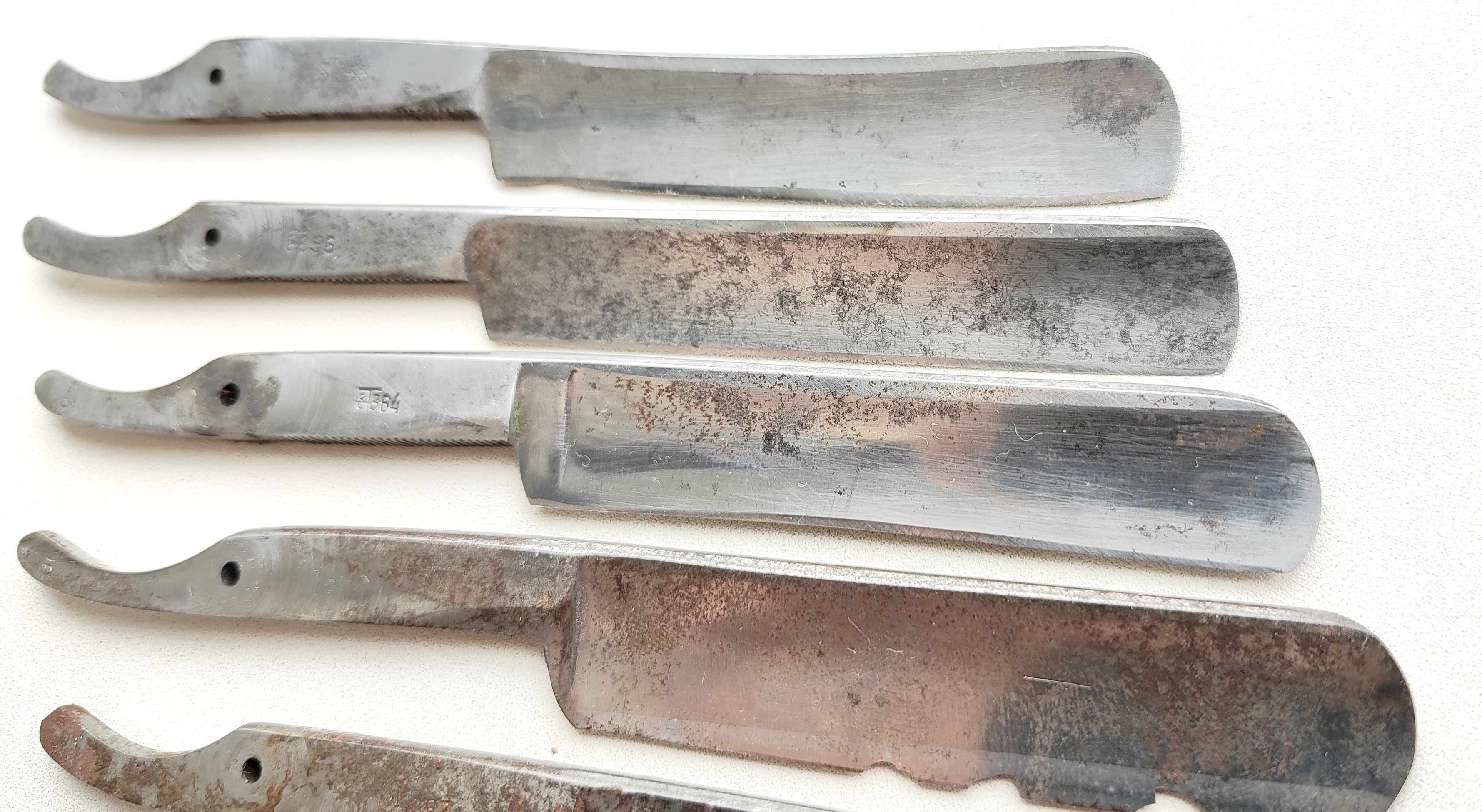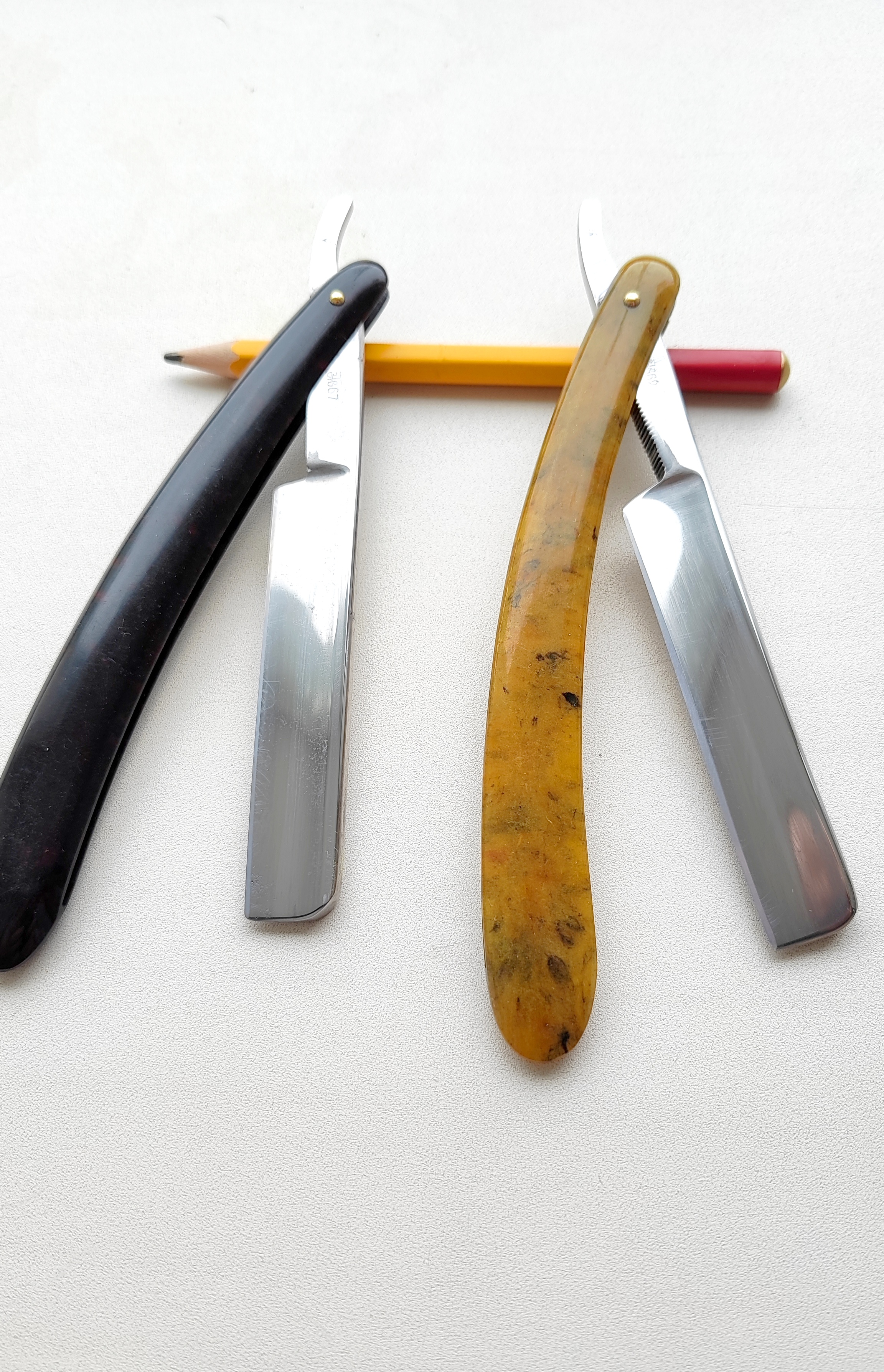 Опасная бритва Ока (в наличии 2 штуки), завод ЗТВ (Вача), 1962 и 1967 годы. Ширина полотна каждой - 15 мм, все родное, без футляров. Бритвы попали ко мне с уточенностями, вручную почистил и заточил. Подготовлены мной к бритью. Ока - бритва из водной серии, куда еще входили Кама, Волга, Яхта. Прямой нос и прямая линия кромки с небольшой шириной полотна - хорошо подойдут для окантовки бороды.
