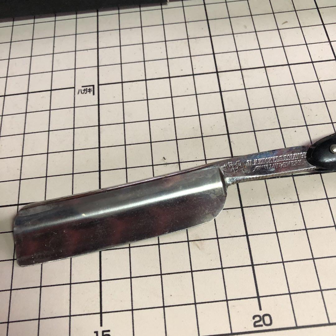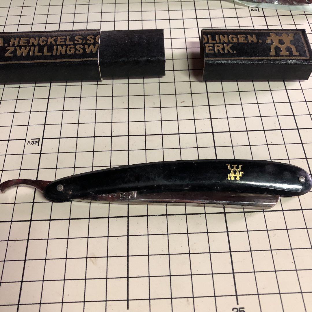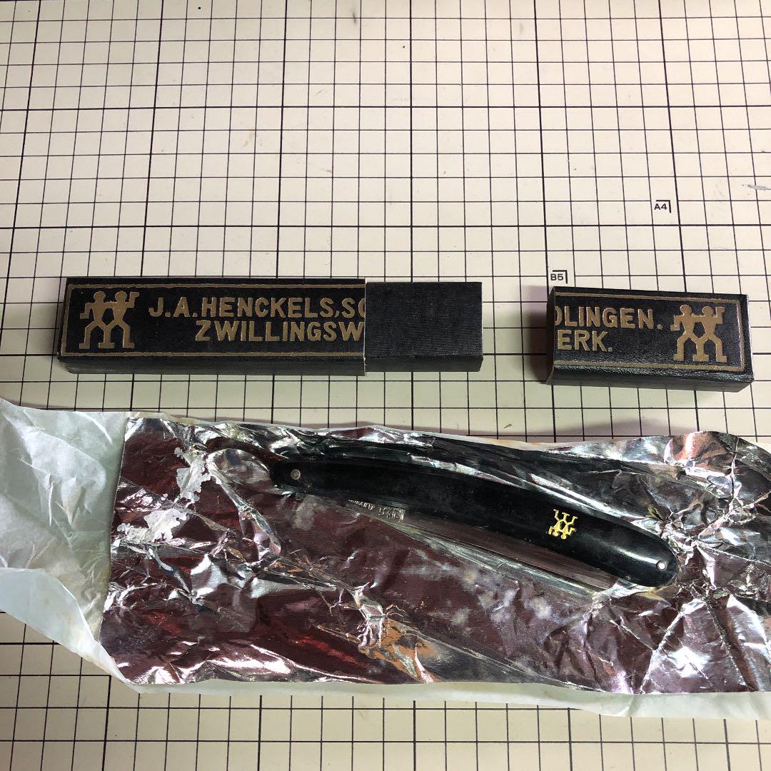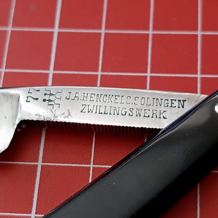 Некоторые бритвы Henckels уже отработали своё. Одно такое лезвие имеет знак Близнецов и ряд глубоко вытравленных цветов. Лезвие было найдено с резной ручкой, которая сделана предположительно из кости, несмотря на довольно бледный и гладкий вид поверхности. Большинство моделей резных ручек других фирм оформлены довольно несложно, в виде прямых линий или, возможно, резных вдоль края ручки. Резные ручки Henckels более сложны в оформлении, и бывают изменены даже по контуру. Задняя сторона хвостовика этой бритвы маркирована «GRAEF/SCHMIDT». Коробка из-под ножниц указывает на то, что эта фирма была какое-то время единственными торговыми представителями бритв Henckels в Соединённых Штатах.