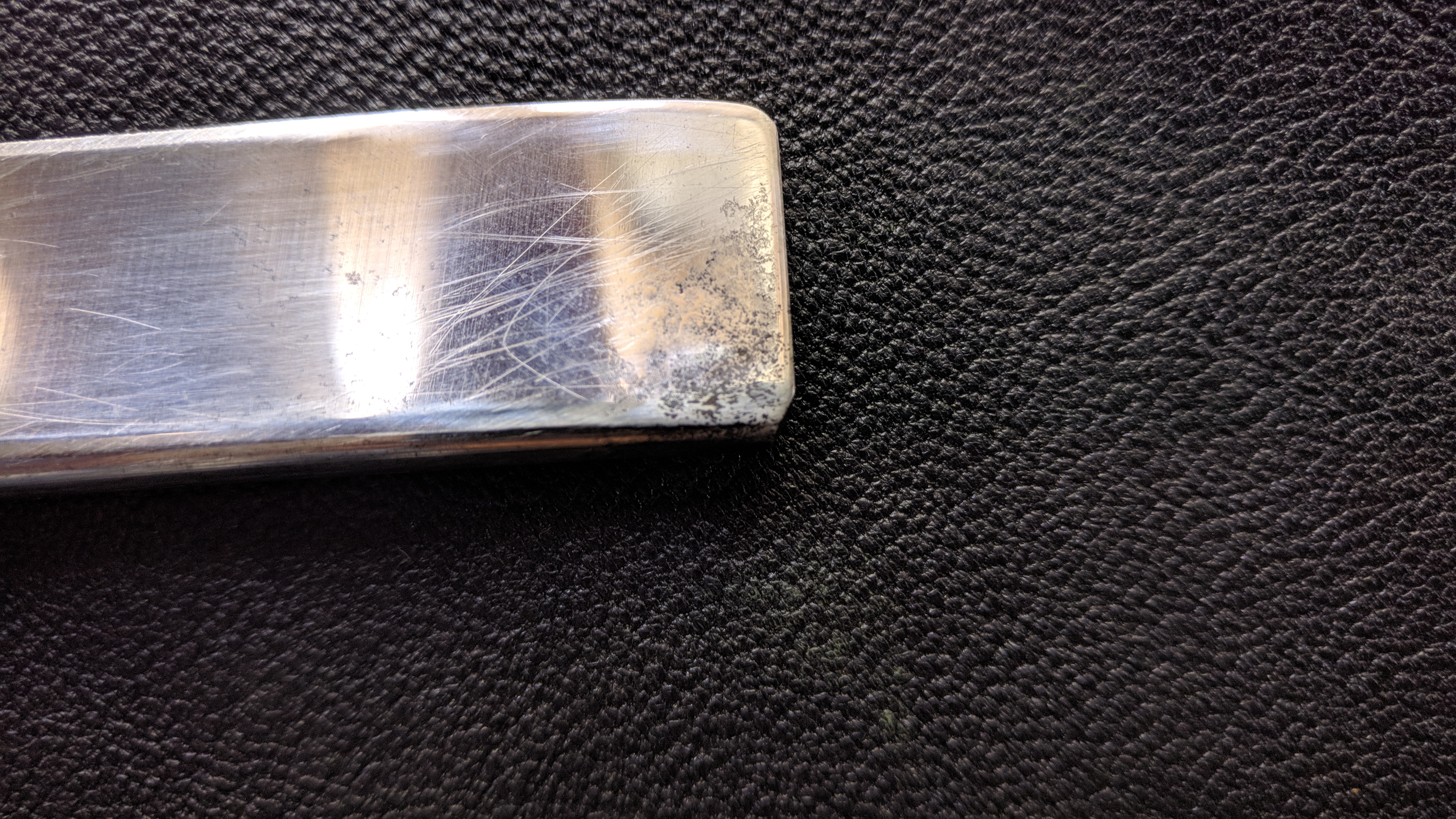Прокладкой между частями ручки служит свинцовый металл. К сожалению, такие перламутровые ручки довольно хрупки. Большая удача для современного коллекционера – найти образец этой красивейшей ручки без трещин и сколов. Мне повезло найти две такие бритвы, но обе были со сломанными ручками. Было отмечено, что ручки были разных размеров под разную ширину бритв.