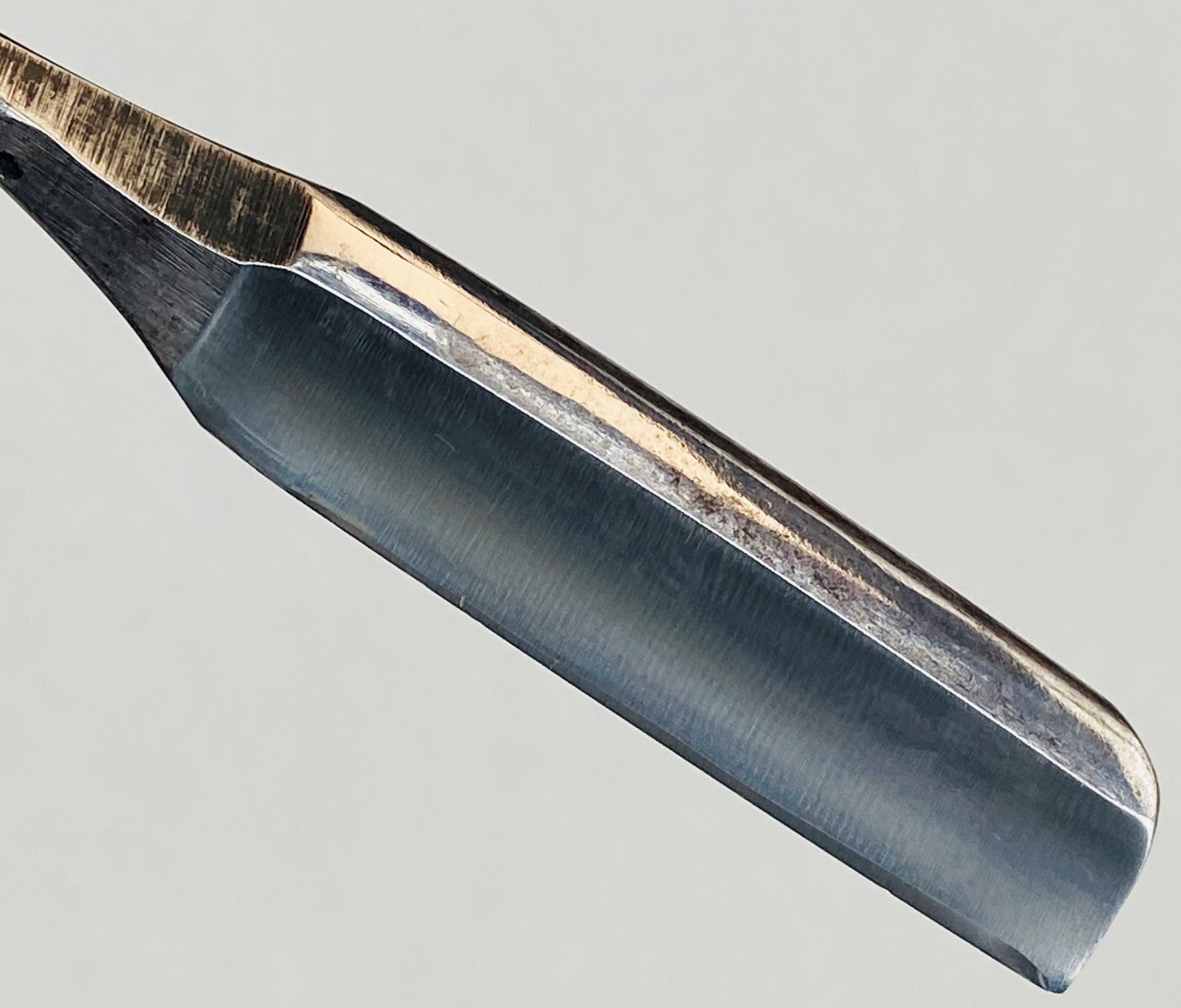 Клинок в хорошем состоянии.Произвел восстановительные работы по коррекции утОчки обушка,шлифовки и полировки. Родная оправа не сохранилась,но дабы не увеличивать конечную стоимость предмета,поставил трёх-пиновую оправу от старинного немца.Ручка восстановлена,но поз гарантийной защитой. Ничего там не должно поломаться, но если в процессе пользования ручка сломается в месте ремонта,тогда бесплатно все поменяю. Но, уверен,все там хорошо проклеено и послужит долго.Кромочка равномерна по всей длине.Достаточно тяжёлая.Заточена и готова к бритью.