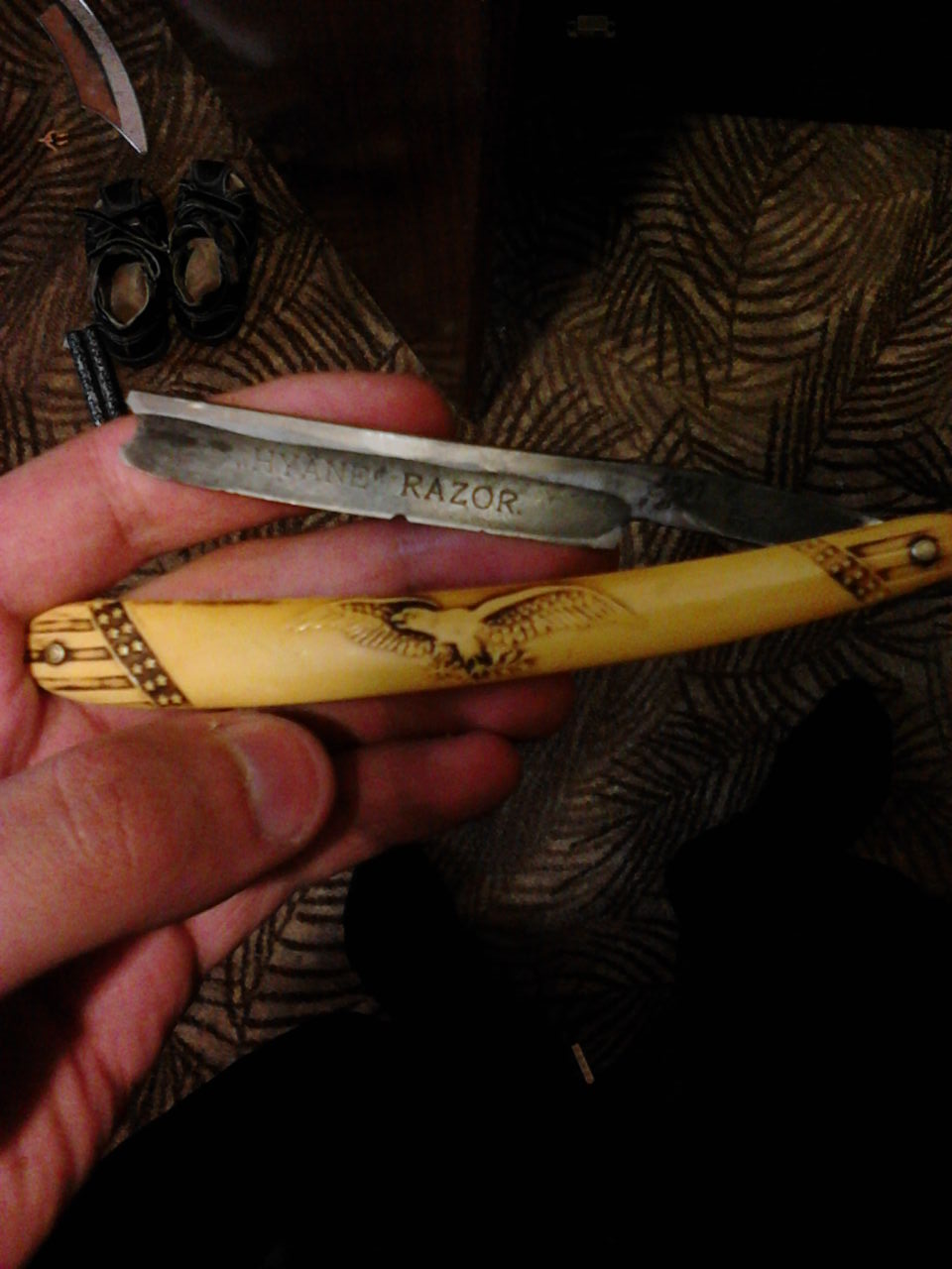 Бритва "Переживёт моего правнука"Уважаемые форумчане. Выкладываю фото бритвы. Буду благодарен за любую информацию. И что за животное на эрле?