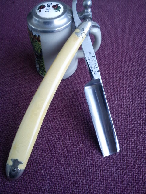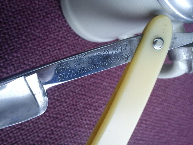 И еще бритва этой фирмы...Юбелейная.По всему видно концы лезвий обломились...кто-то их подрезал аккуратно...укоротил...Обидно Re: GEO.H.WEYER. KANSAS CITY MO.Rumata:Классные бритвы, только у тебя на всех снимках одна и та же композиция (фирменный знак с кружкой?), поэтому не очень просто масштаб на глаз определить, да и пятое по счету фото тяготит имхо... Кружка у тебя 0,3л или 0,5л? Это я так, к слову...