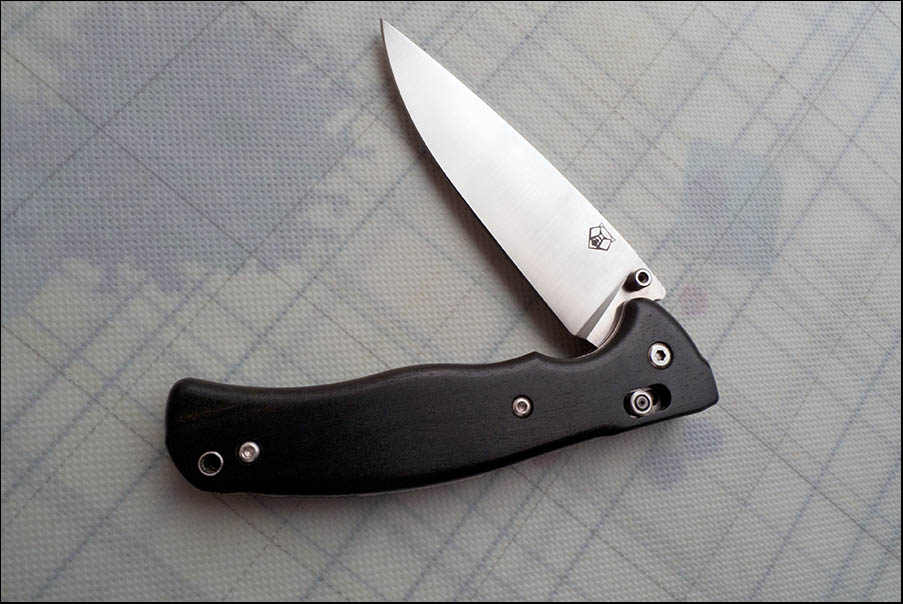 Re: Наши ножиВот один из моих ножей. Сталь Х12МФ, геометрия тройной клин. Боковины из титана, накладки - чёрное дерево. Ручная работа.