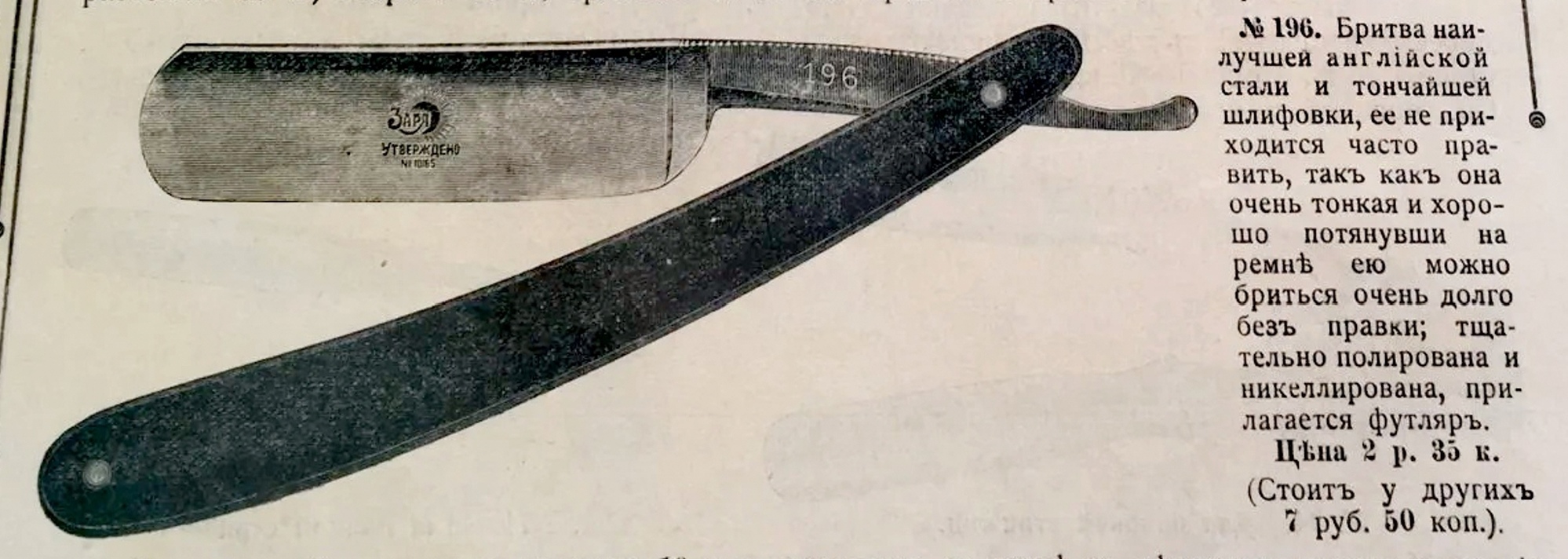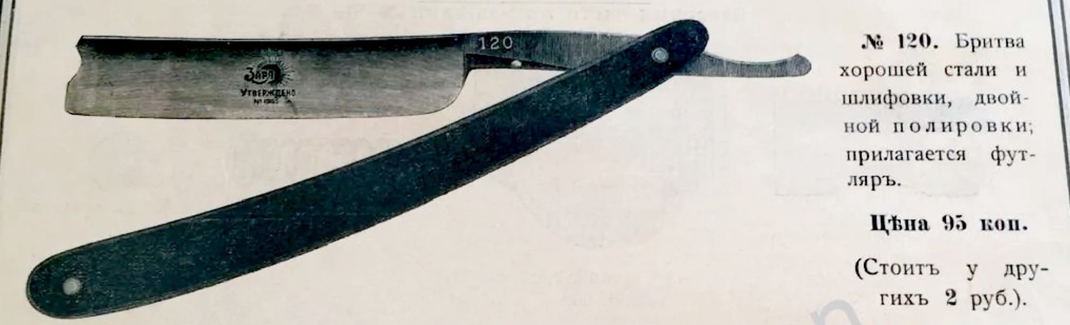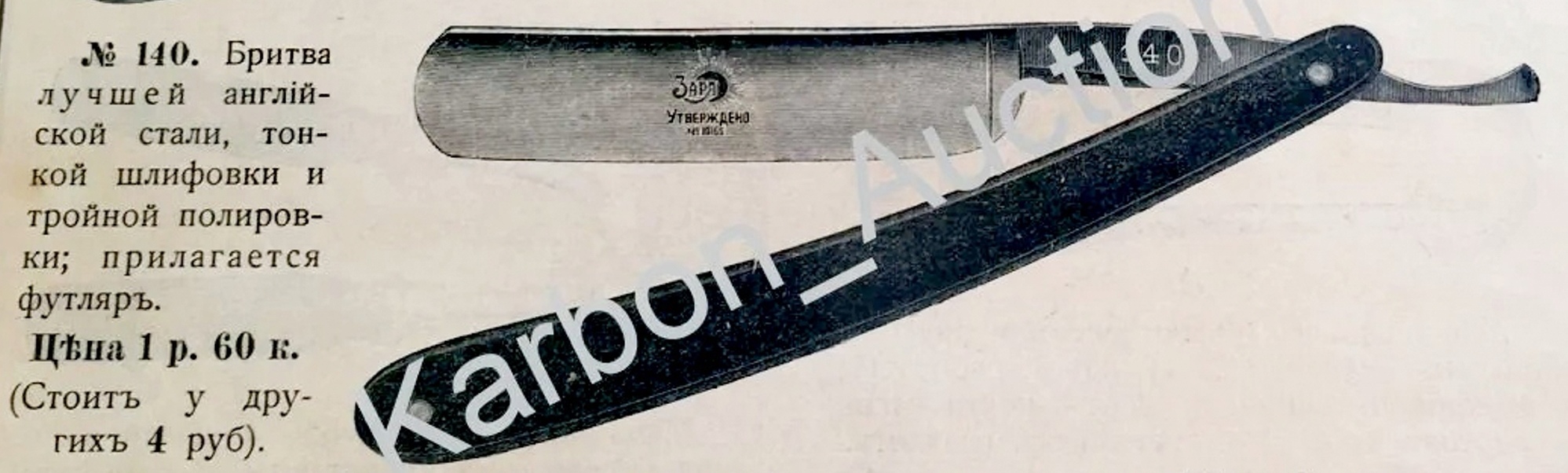 Изучив визуально коробку и саму бритву я прихожу к выводу, что эта тема не российская и не советская. Прибор, равно как и его упаковка, сделан "за бугром". Ибо стиль изготовления тары и девайса этому подтвержение. Даю 99%, но 1% всё-таки оставляю на ошибку (я не волшебник, я только учусь). Многие фирмы из Золингена имели марку с русским написанием. Я могу привести очень много доказательств. Номер модели 196, также говорит о её "забугорной" родословной. Не думаю что мы не знали бы о русской марке с ассортиментом бритв минимум 196 штук. И ещё один момент, патент - чисто немецкий вариант - Марка утверждена за №10165. Если сравнить номера патентов, то время его выдачи - конец 19-го века! Т.е. по моим догадкам что-то в районе 1880-90г.г. Это конечно не время изготовления девайса, хотя может быть и оно. Ручка из прозрачного пластика - думаю, это сверстник зрелого возраста наших дедушек. Остаётся только найти фабрику, выпускавшую (скорее всего в Золингене) ТМ "Заря" (пат.№10165). Вопрос времени... Ремонт опасных бритв, звонить с 11-00 до 23-00, +79267729357, (whats app, telegram, VK), спросить Олега.